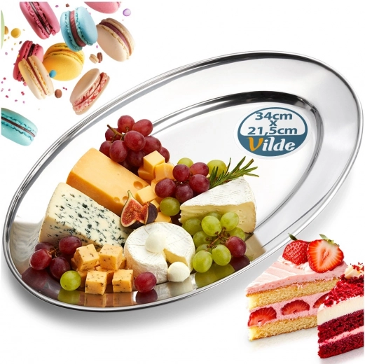 Elegante ovale schaal van roestvrij staal met afmetingen 34 × 21,5 × 3 cm, ideaal voor het serveren van voorgerechten, kaas, fruit en desserts. Dankzij het gepolijste oppervlak en de hoge duurzaamheid is hij perfect voor thuis en de horeca, en staat hij op elke tafel tijdloos en stijlvol.