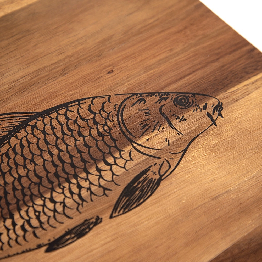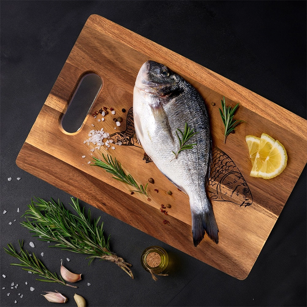 Praktische en stijlvolle keukenplank van natuurlijk acaciahout met afmetingen 36 × 24 cm en een dikte van 1,5 cm. Biedt hoge duurzaamheid, natuurlijke antibacteriële bescherming en comfortabel dragen dankzij de ergonomische handgreep. De opvallende visprint en de tekst “Fish” maken gescheiden gebruik voor vis en zeevruchten eenvoudig, wat helpt de hygiëne te waarborgen en smaken niet te mengen.