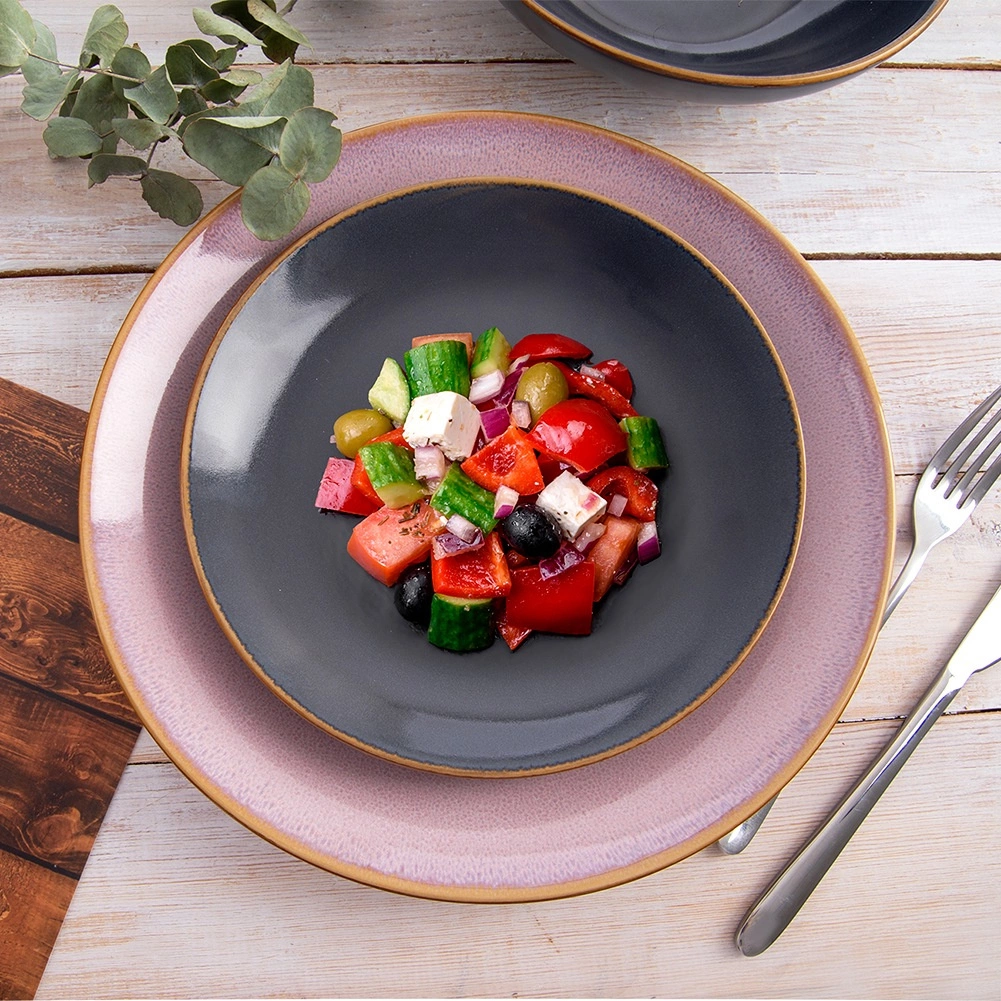 Stijlvol dessertbord uit de Glaze-collectie met een moderne grijze geglazuurde afwerking en subtiele spikkels. Dankzij de diameter van 20,5 cm is het perfect voor taarten, gebak, zoete lekkernijen en kleinere snacks. De klassieke ronde vorm past bij diverse soorten servies en is gemakkelijk te combineren met andere stukken.
