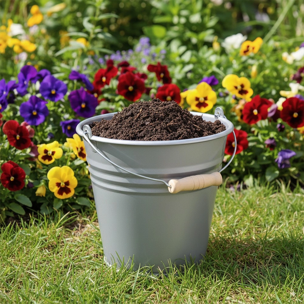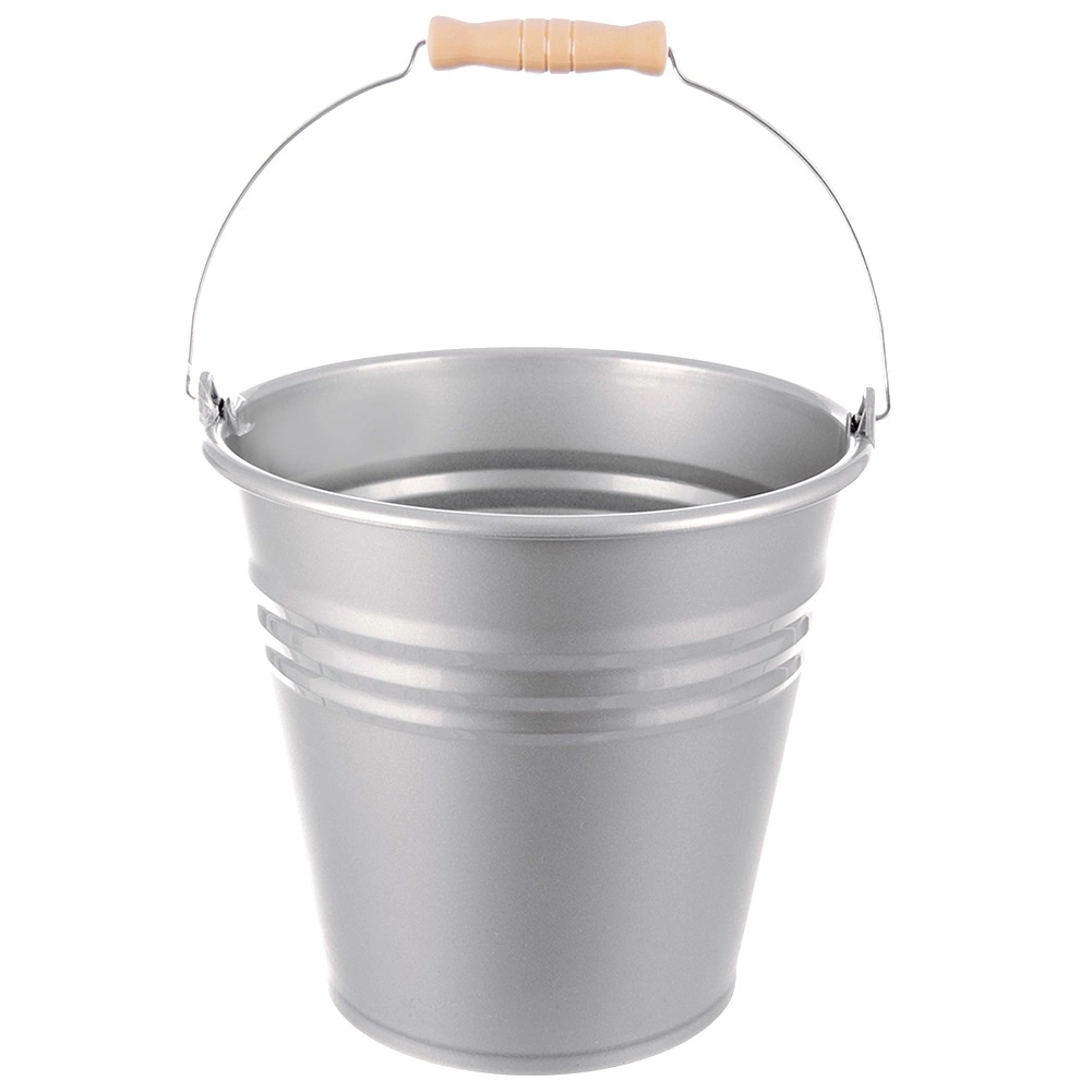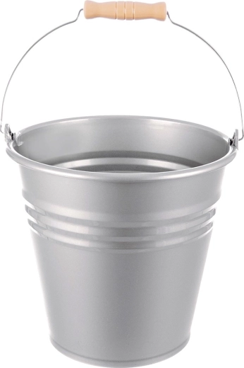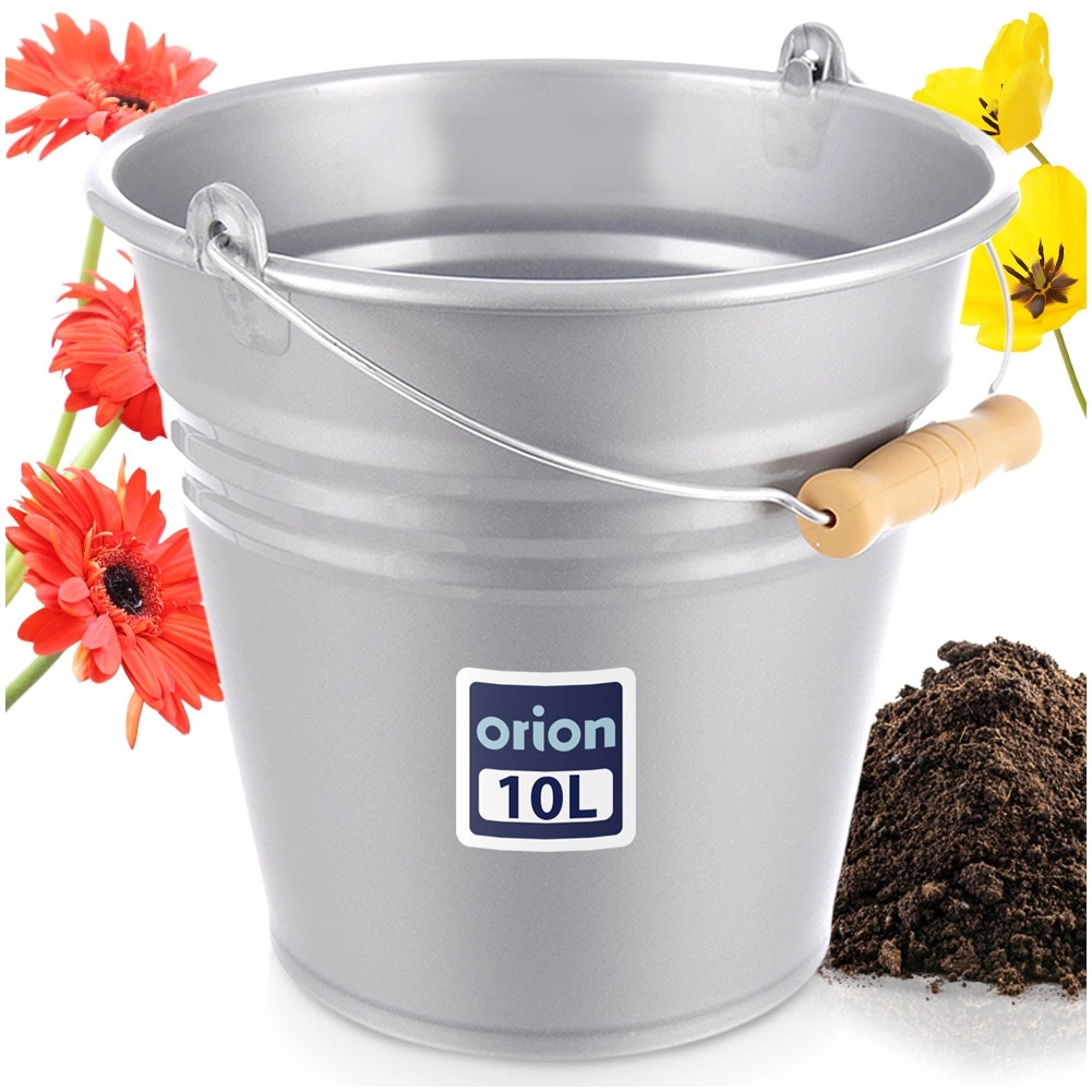 Praktische kunststof emmer met een inhoud van 10 l in een elegante grijze kleur met een staal-look afwerking. Licht en duurzaam, met een comfortabel ergonomisch handvat met houtlook voor eenvoudig dragen. Ideaal voor huishoudelijk schoonmaken, tuin en werkplaats, met buitenafmetingen 29 × 29,5 × 28,5 cm.