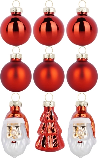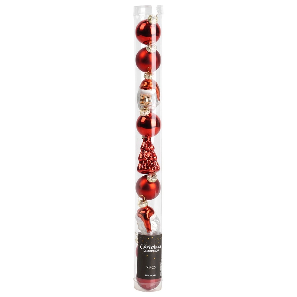 Elegante set rode kerstversieringen die je decoratie een klassieke glans en betoverende sfeer geeft. Bevat 9 stuks onbreekbare versieringen van hoogwaardige kunststof – 6× ballen met een diameter van 3 cm, 2× SANTA-figuurtje van 5 cm en 1× boompjesfiguurtje van 5 cm. De combinatie van glanzende en matte afwerking zorgt voor een indrukwekkende compositie en is veilig voor kinderen en huisdieren.