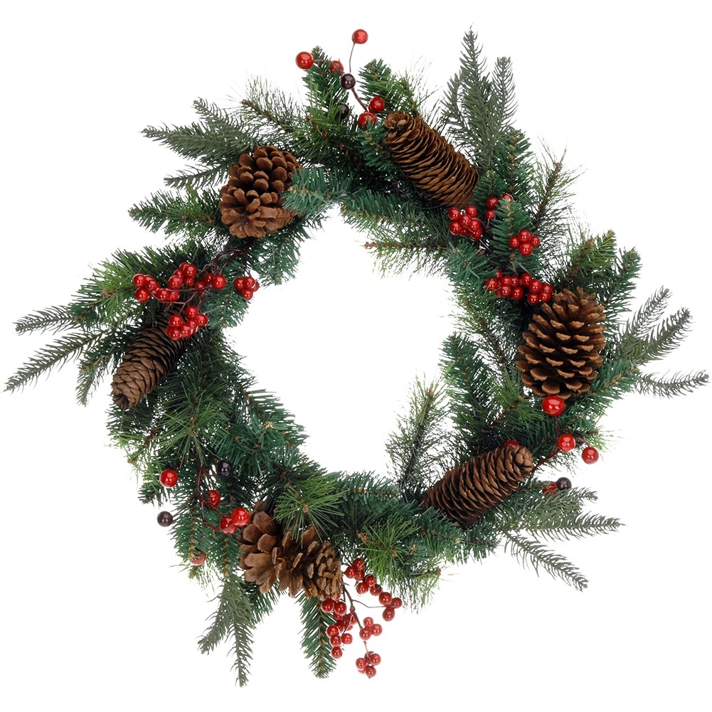 Klassieke kerstkrans met een diameter van 45 cm van realistisch naaldgroen, rijk versierd met dennenappels en takjes met rode bessen. Ideaal voor aan de deur, aan de muur of als middendecoratie op tafel. Realistische uitstraling, duurzame afwerking en een tijdloos feestelijk design voor een gezellige kerstsfeer.