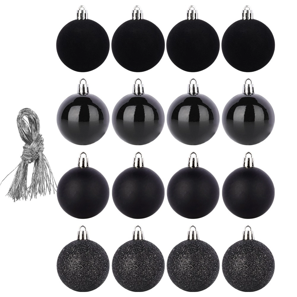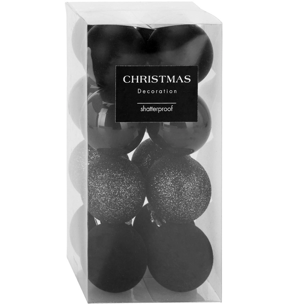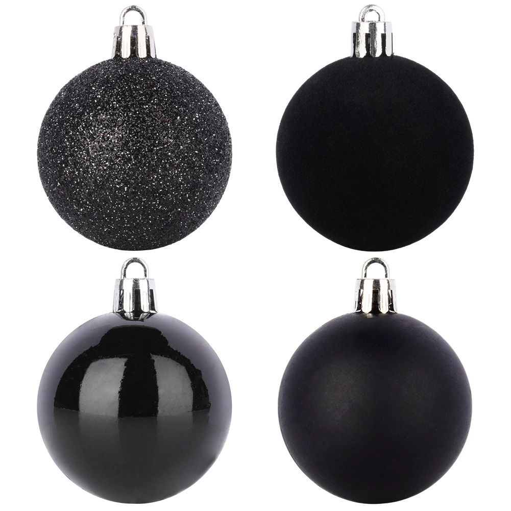 Creëer thuis een unieke feestelijke sfeer met een set hoogwaardige, onbreekbare ornamenten in elegante zwarte kleur. Dankzij de mix van afwerkingen – mat, glans, glitter en velours – krijgt uw kerstboom en andere decoraties een modern en indrukwekkend uiterlijk.