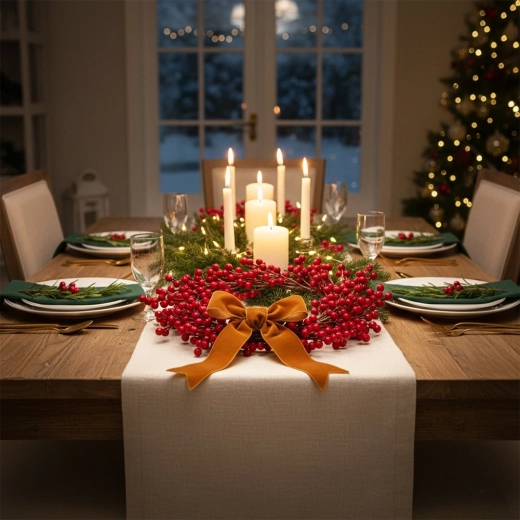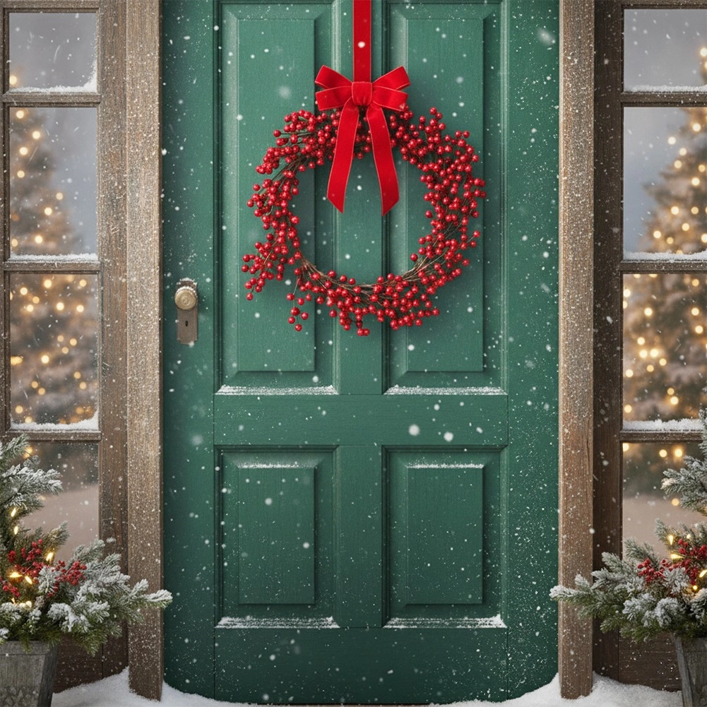 De kerstkrans met hulstbessen in een moderne uitvoering combineert een traditionele uitstraling met een lange levensduur. De rijke compositie van 70 afzonderlijke takjes, elk met 7 kleine bessen, creëert een uitzonderlijk volle en dichte look die direct de aandacht trekt.