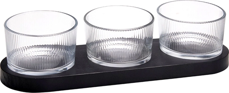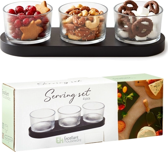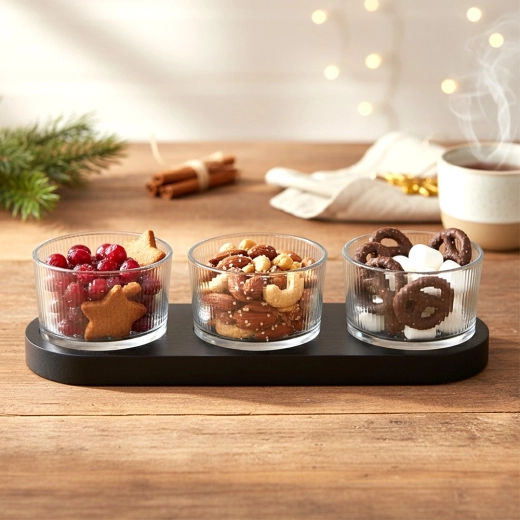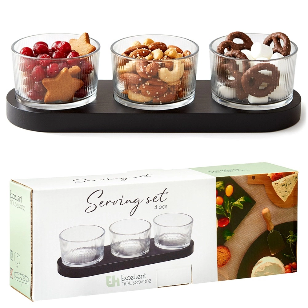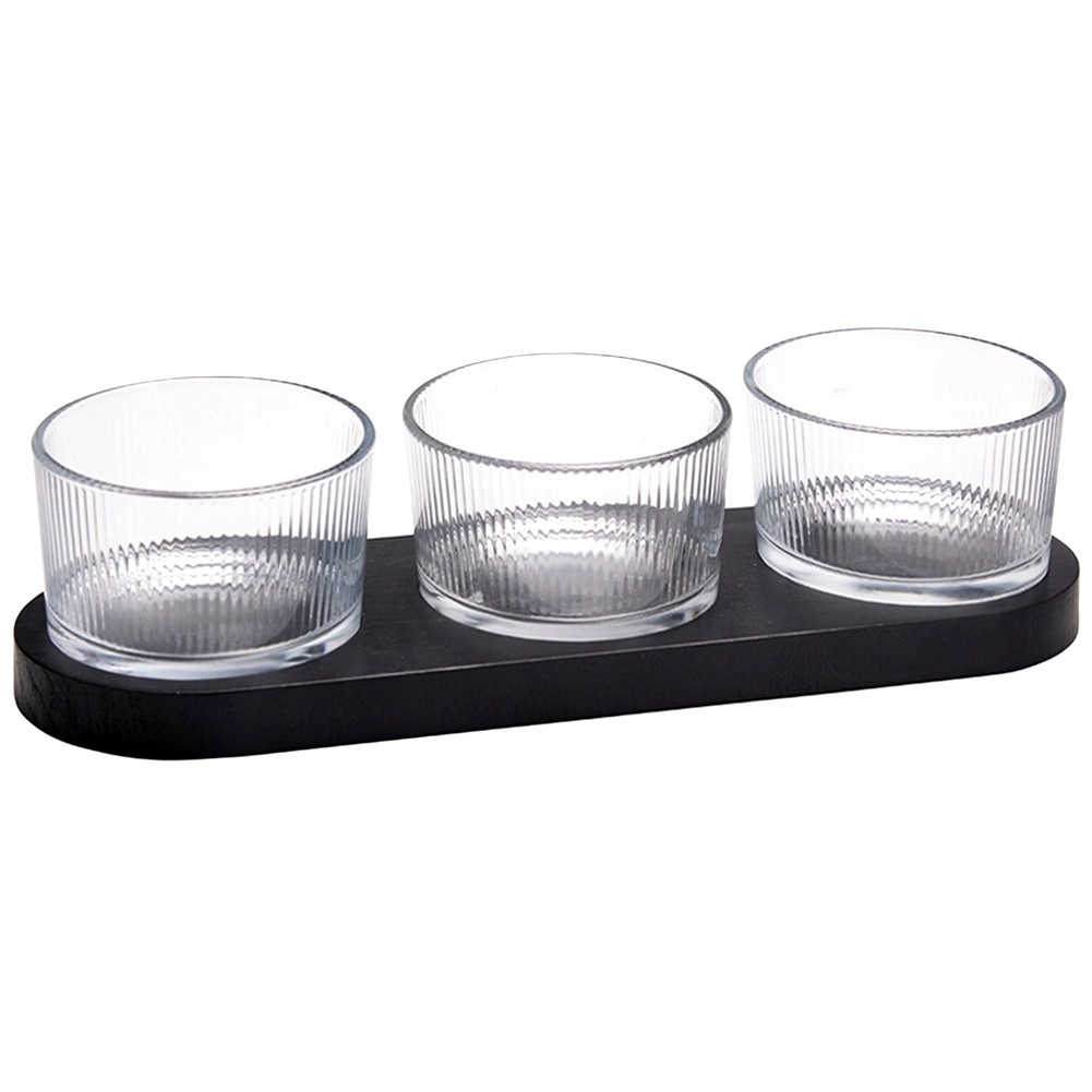 Elegante 4-delige set voor het serveren van hapjes, bestaande uit drie glazen schaaltjes en een rechthoekig houten dienblad in het zwart. Ideaal voor dipsausjes, olijven, nootjes en antipasti. Het moderne design met geribbeld glas en praktische uitsparingen voor stabiliteit van de schaaltjes zorgt voor comfortabel en stijlvol serveren.