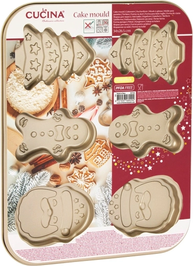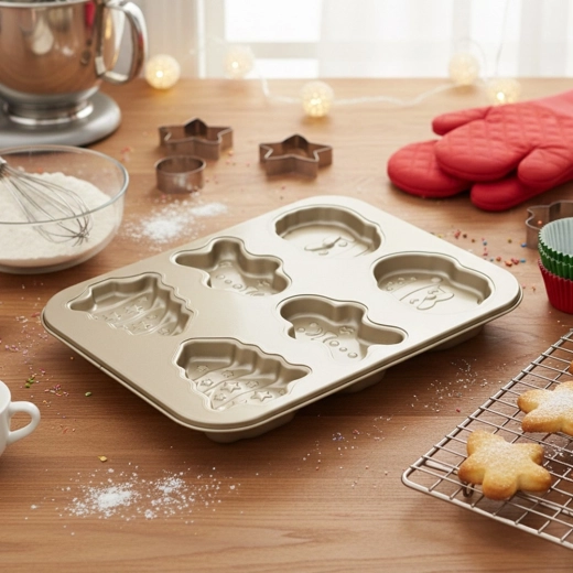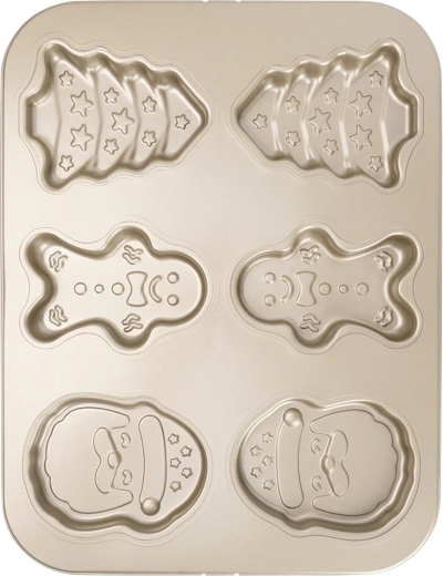 Deze stijlvolle vorm in champagnegoud biedt 6 holtes met drie populaire kerstmotieven. Ideaal voor peperkoekjes, zandkoekjes, maar ook mini-cheesecakes of cupcakes. Het stalen lichaam zorgt voor stabiliteit en egaal bakken, terwijl de PTFE anti-aanbaklaag het makkelijk maakt om zonder gescheurde randen uit te nemen.