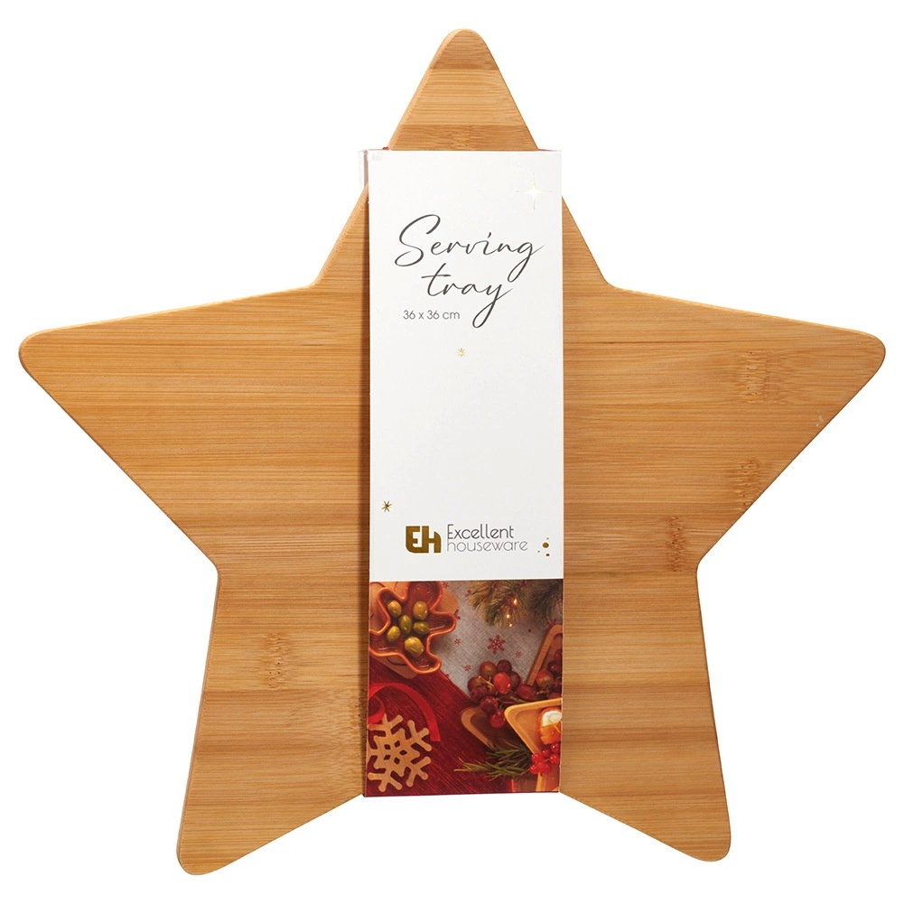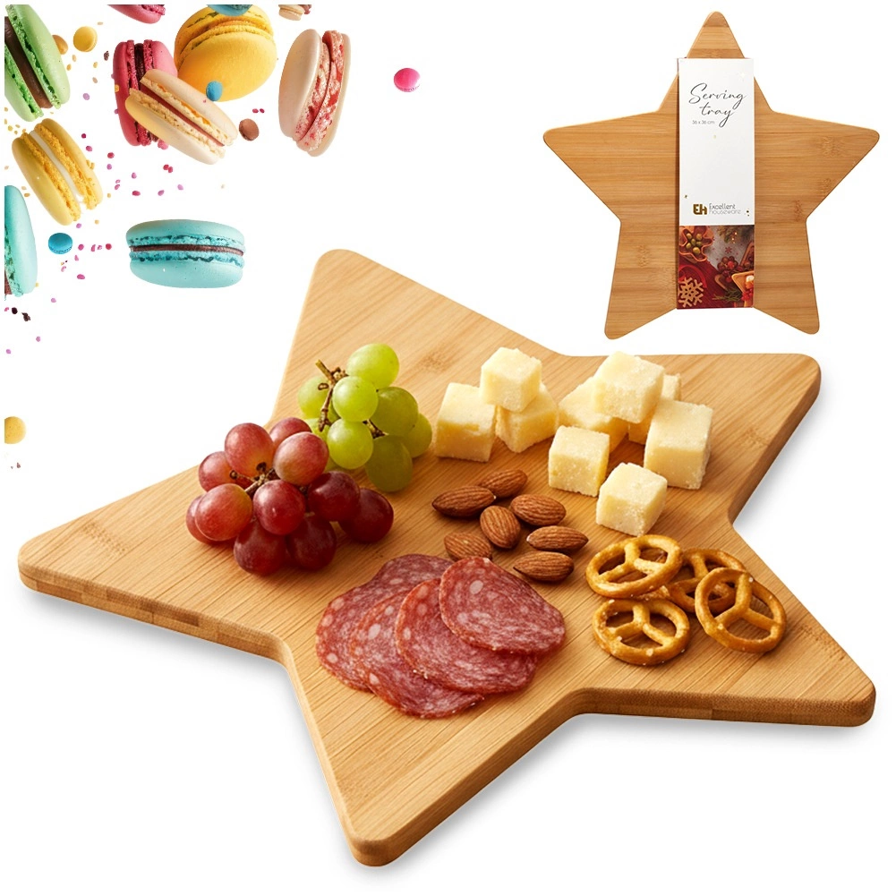 Stijlvolle bamboe plank in stervorm van 36 × 36 cm, ideaal voor het serveren van kazen, vleeswaren, fruit en desserts. Gemaakt van duurzaam gewonnen bamboe, biedt vochtbestendigheid, eenvoudig onderhoud en een effectvol design dat winterse en feestelijke tafels laat stralen.