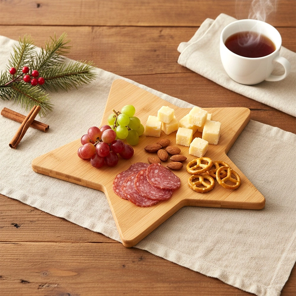 Breng een feestelijke sfeer op tafel met deze elegante bamboe plank in stervorm. Perfect voor dagelijks gebruik én speciale gelegenheden – van kaas- en vleeswarenschotels tot fruit, koekjes en kleine desserts. Natuurlijk bamboe geeft je tafel een warme, moderne uitstraling en is bovendien zacht voor messen.