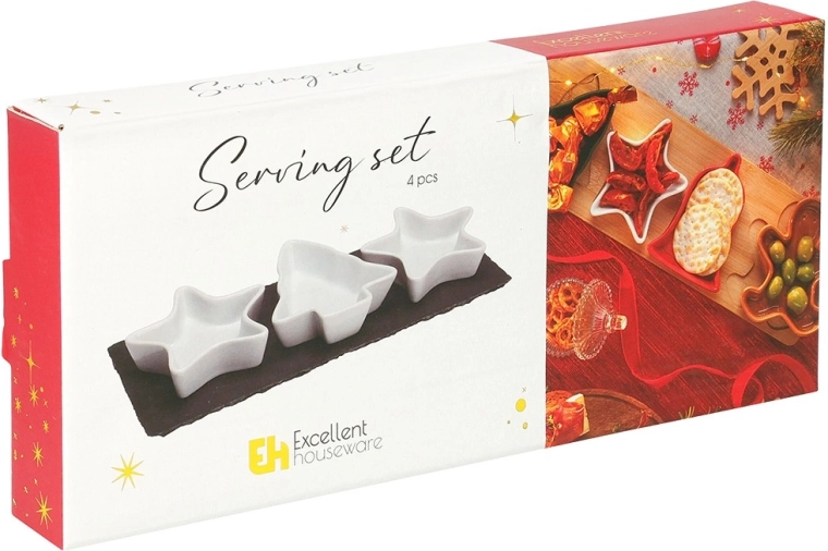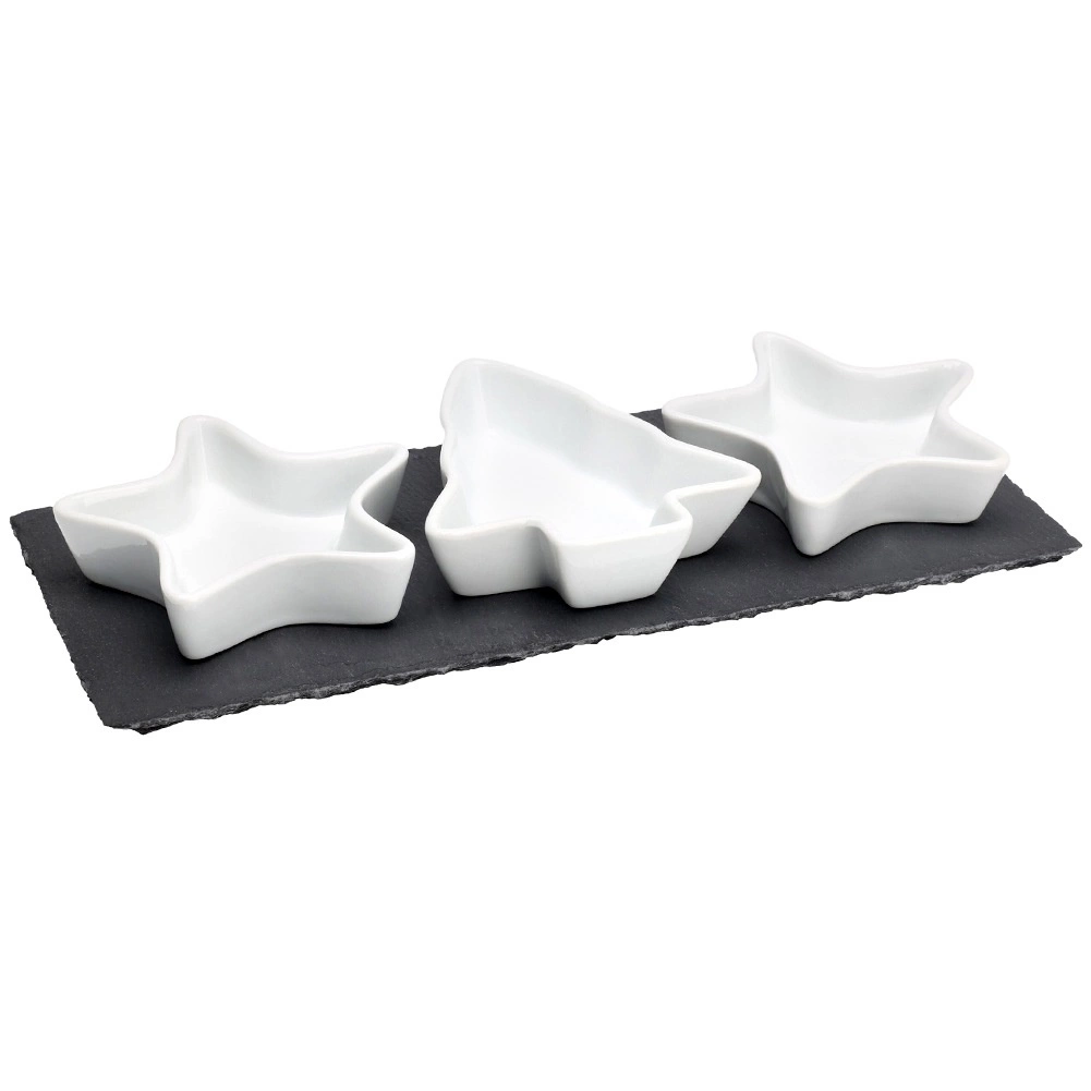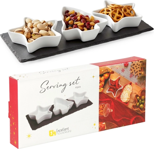 Stijlvolle set voor het serveren van lekkernijen, bestaande uit drie porseleinen schaaltjes in de vorm van een ster en een boompje en een rechthoekig leisteen dienblad. Ideaal voor noten, olijven, dip en andere kleine hapjes tijdens feestelijke bijeenkomsten. Elegant design, hoogwaardig porselein en praktische afmetingen zorgen voor comfortabel en effectief serveren.