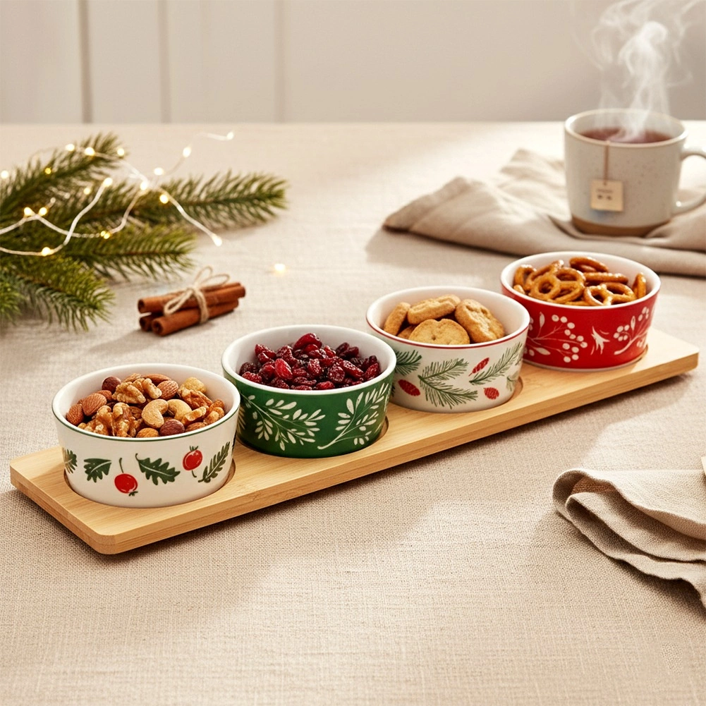 Deze elegante set combineert fijne porseleinen esthetiek met warm bamboehout, waardoor hij niet alleen praktisch maar ook decoratief is. Elk schaaltje heeft een ander, schattig feestelijk motief dat je tafel een betoverende sfeer geeft.