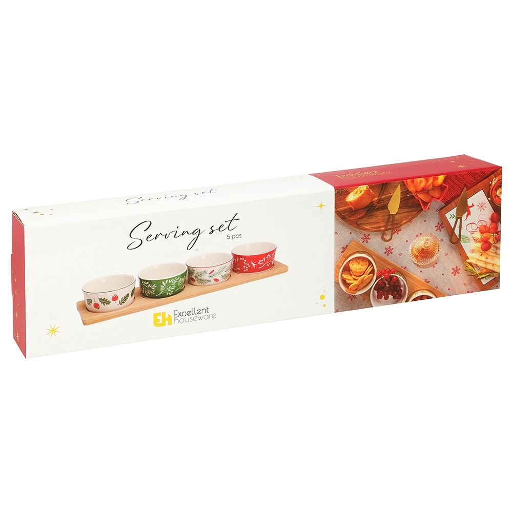 Stijlvolle serveerset met een bamboe dienblad en 4 porseleinen schaaltjes met kerstmotieven. Ideaal voor nootjes, olijven, dips en kleine hapjes tijdens feestelijke bijeenkomsten. Stabiele uitsparingen in het dienblad voorkomen dat de schaaltjes verschuiven; de porseleinen schaaltjes zijn vaatwasmachinebestendig. Afmetingen dienblad 38 × 10 × 4,5 cm, schaaltje 8,5 × 4 cm, inhoud 140 ml.