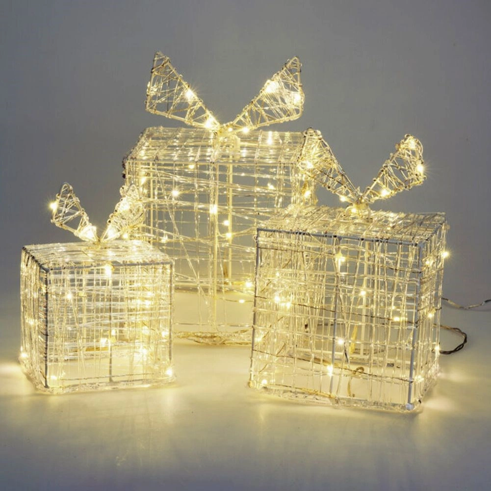 Creëer binnen en buiten een magische kerstsfeer met deze set van drie decoratieve cadeaus met LED-verlichting. De combinatie van wit metaal en transparant acryl oogt modern en strak, terwijl het warme witte LED-licht de decoratie een aangename, feestelijke uitstraling geeft. Dankzij de verschillende formaten maak je eenvoudig een indrukwekkende compositie bij de boom, op het terras, in de hal of in een etalage.
