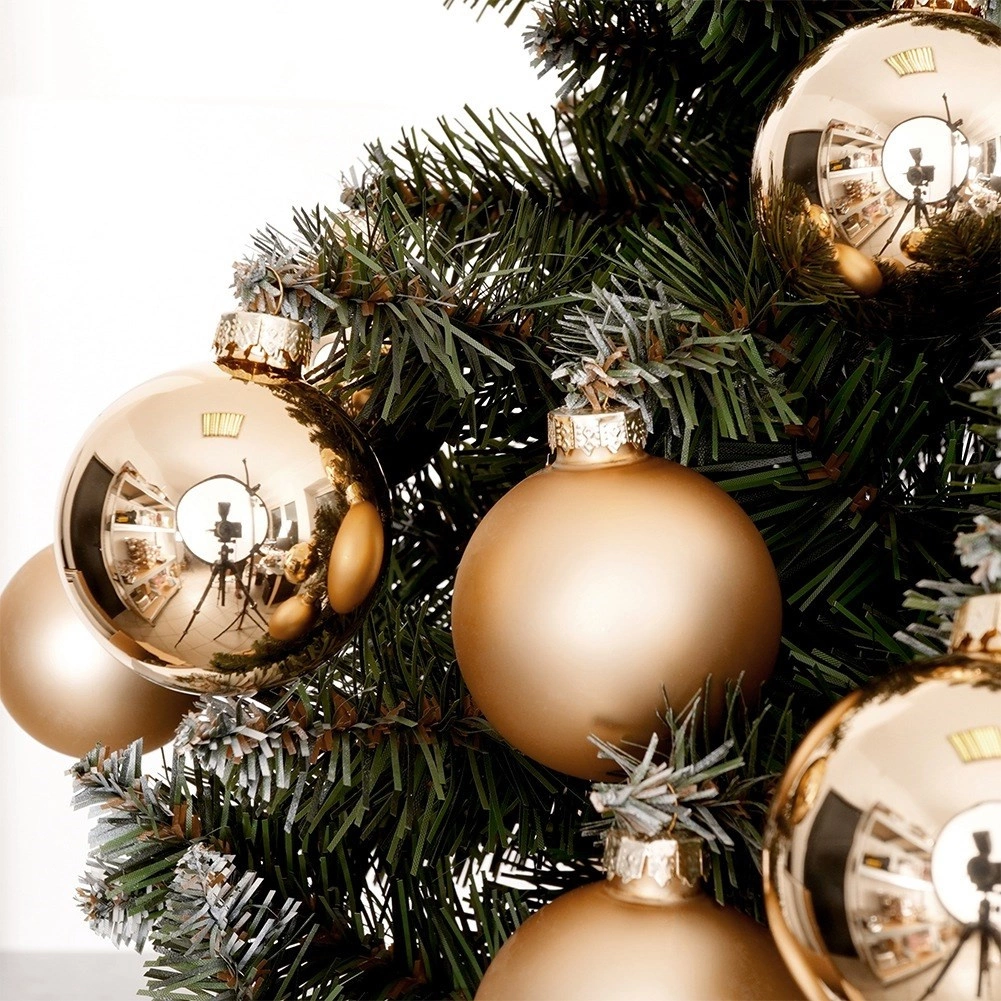 De set combineert glanzende en matte gouden ballen die samen een evenwichtige wisselwerking van licht en textuur op je boom creëren.