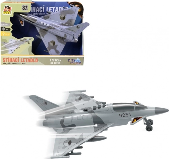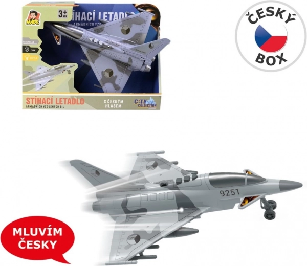 Beleef actievolle luchtmissies met dit gedetailleerde jachtvliegtuig, versierd met de onderscheidingstekens van de Tsjechische Republiek. Het model biedt authentieke dialogen in het Tsjechisch tussen de verkeerstoren en de piloot, en het geluid van een vliegende straaljager die de spelbeleving versterken.