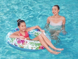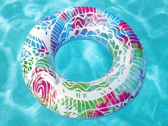 De BESTWAY opblaasring in een kleurrijk design brengt plezier in het water en zorgt voor ontspannen relaxen. Robuust PVC (0,21 mm) garandeert een lange levensduur en weerstand tegen zout water, terwijl de praktische handgrepen het instappen vergemakkelijken en zekerheid bieden tijdens het zwemmen.