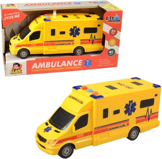 Realistische speelgoedambulance met vliegwielaandrijving met , sirene-geluid en spraakmeldingen van meldkamer en bemanning. Kunststof uitvoering, lengte ca. 19 cm, ideaal voor jongens en meisjes vanaf 3 jaar.