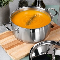 De premium roestvrijstalen pan uit de ANETT-lijn is een uitstekende keuze voor het bereiden van soepen, pasta en voor zacht stoven. Hoogwaardig 18/10 roestvrij staal met een matte afwerking en een elegante gepolijste band aan de bovenzijde zorgt voor een lange levensduur en een tijdloze uitstraling. Dikke wanden en een massieve constructie garanderen stabiliteit en duurzaamheid bij dagelijks gebruik.