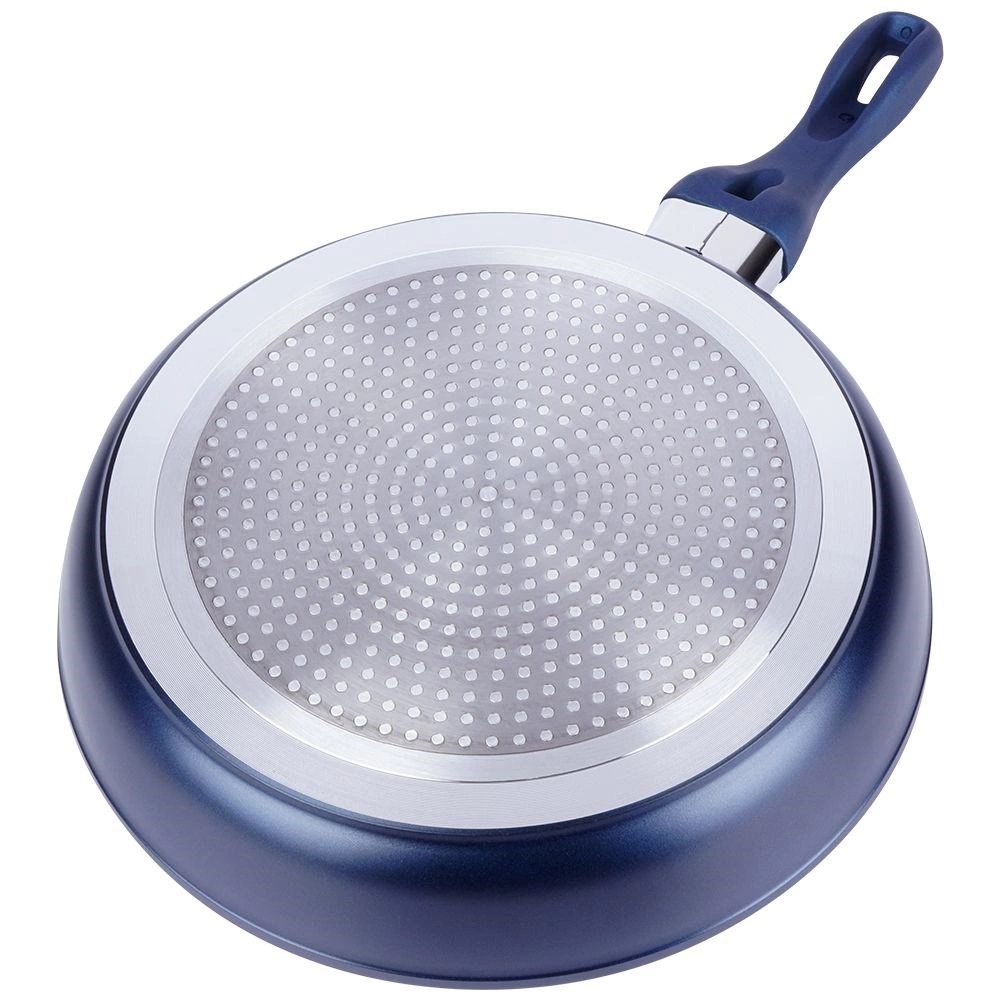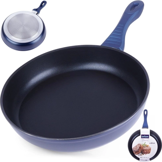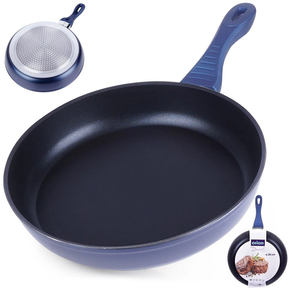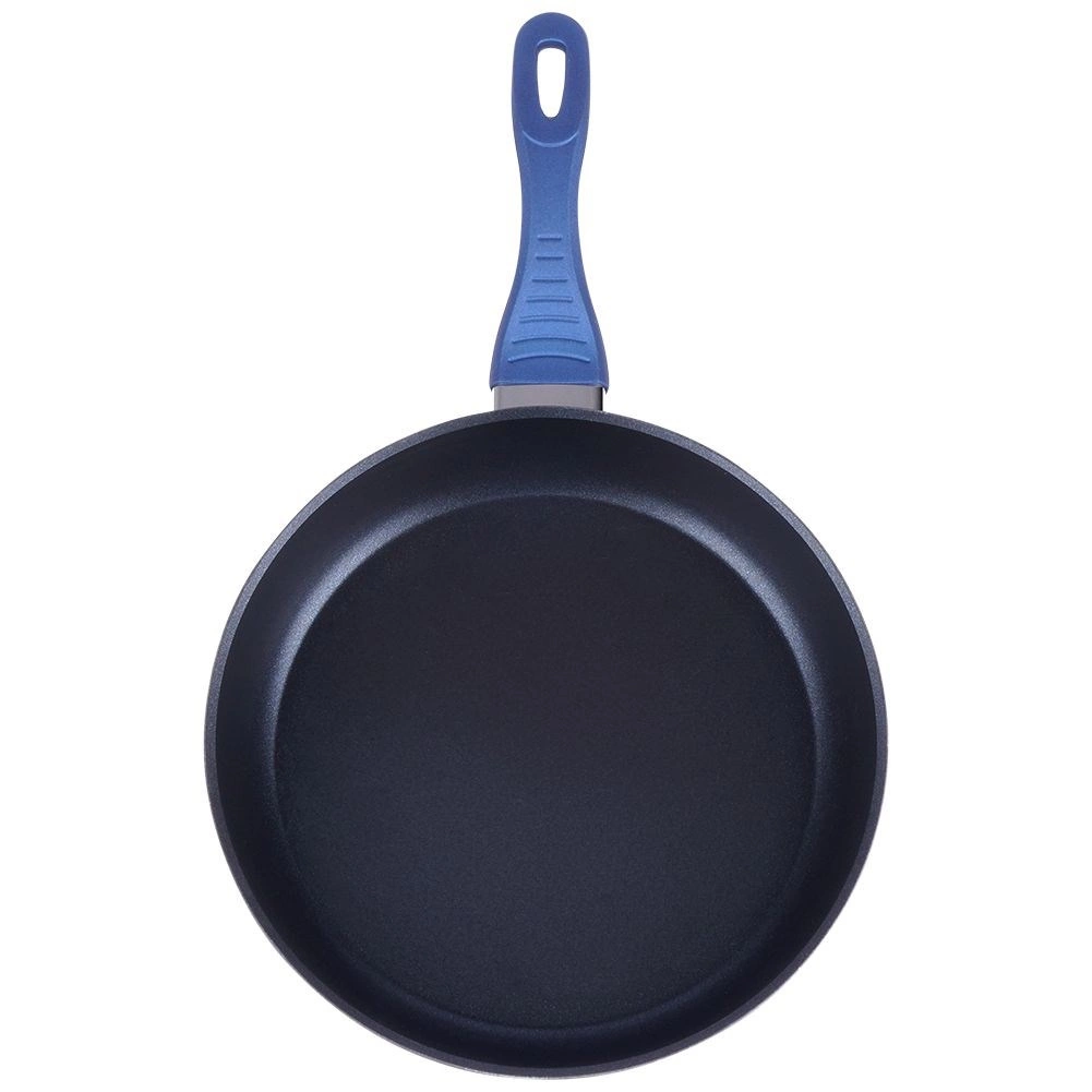 Robuuste aluminium pan met een diamanten antiaanbaklaag voor snel en gelijkmatig bakken. Zonder PFOA en PTFE, met een ergonomische handgreep met siliconen oppervlak in blauw. Geschikt voor gas-, elektrisch, keramisch, halogeen en inductie kookplaten en vaatwasserbestendig.