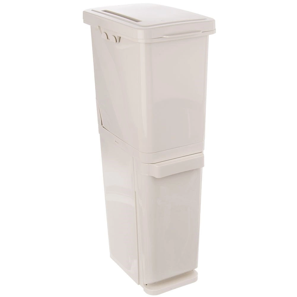 Tweelaagse oplossing maakt het mogelijk de containers boven elkaar samen of afzonderlijk te gebruiken. Dankzij het smalle profiel past de bak onder standaard kasten, wat ruimte bespaart in keuken, kantoor of wachtruimte. Elke container heeft een apart deksel – de onderste klapt naar voren open, de bovenste opent van boven.