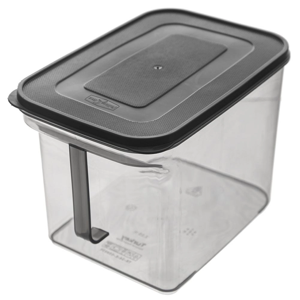 Praktische voorraadbus voor droge voedingsmiddelen met deksel en zijdelingse handgreep voor eenvoudig dragen. Ideaal voor bloem, suiker, zout, griesmeel of ontbijtgranen. Inhoud 3,25 l en afmetingen 23 × 15,5 × 15,5 cm. Gemaakt van duurzaam, transparant donkergrijs plastic, waardoor je de inhoud snel kunt controleren. Vochtvrij bewaren, afsluitend deksel, vaatwasserbestendig, magnetronbestendig zonder deksel en vriezerbestendig.