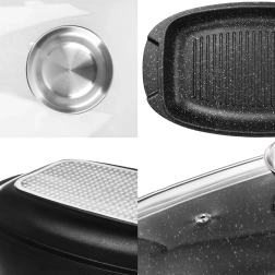 Dankzij de geïntegreerde doseerder in het glazen deksel kunt u tijdens het koken comfortabel water, bouillon of wijn bijgieten zonder het deksel op te tillen. Beide delen (braadslede en grillpan) zijn compatibel met alle soorten fornuizen, inclusief inductie, en kunnen ook in de oven tot 200 °C worden gebruikt. Comfortabele zijgrepen vergemakkelijken de handling en de hele set is vaatwasmachinebestendig.