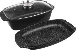 Praktische granietset voor dagelijks koken: diepe braadslede 5 l, grillpan die ook als deksel dient en een hittebestendig glazen deksel met doseerder. Robuust gegoten aluminium met dubbele PFLUON GRANIT coating slaat warmte uitstekend op en zorgt voor een gelijkmatige bereiding met minimale olie.