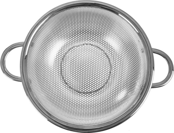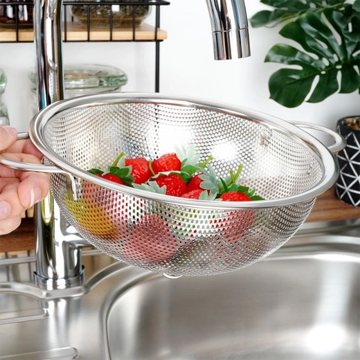 Universele keukenzeef in komvorm voor dagelijks gebruik. Ideaal voor het wassen van fruit en groenten, het afgieten van pasta en rijst. Gemaakt van roestvrij staal in elegante zilverkleur, met comfortabele handgrepen, stabiele pootjes en vaatwasserbestendig. Serie ANETT.