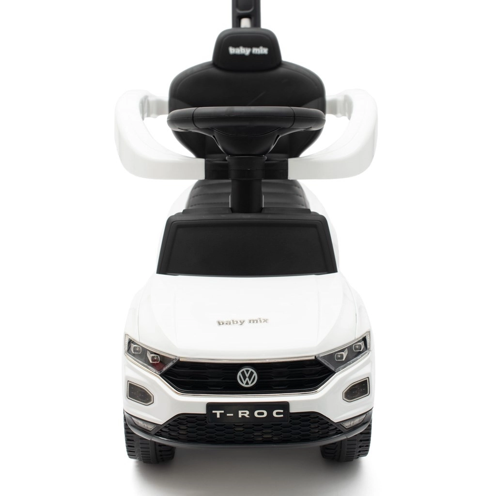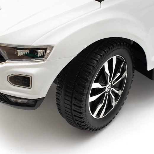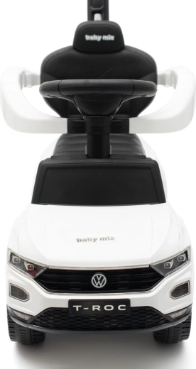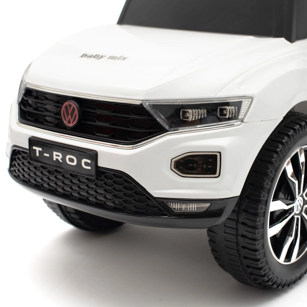 De gelicentieerde VOLKSWAGEN T-ROC loopauto in het wit overtuigt met een realistische uitstraling, hoogwaardige afwerking en oog voor detail. Het ondersteunt de ontwikkeling van motoriek en balans van het kind en biedt tegelijk een comfortabele en veilige rit dankzij de brede zitting met rugleuning, kantelbeveiliging en stevige kunststof wielen met metalen assen.
