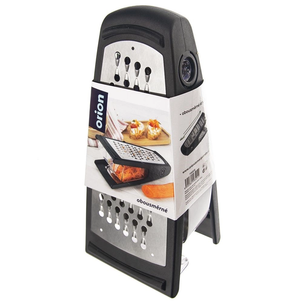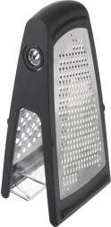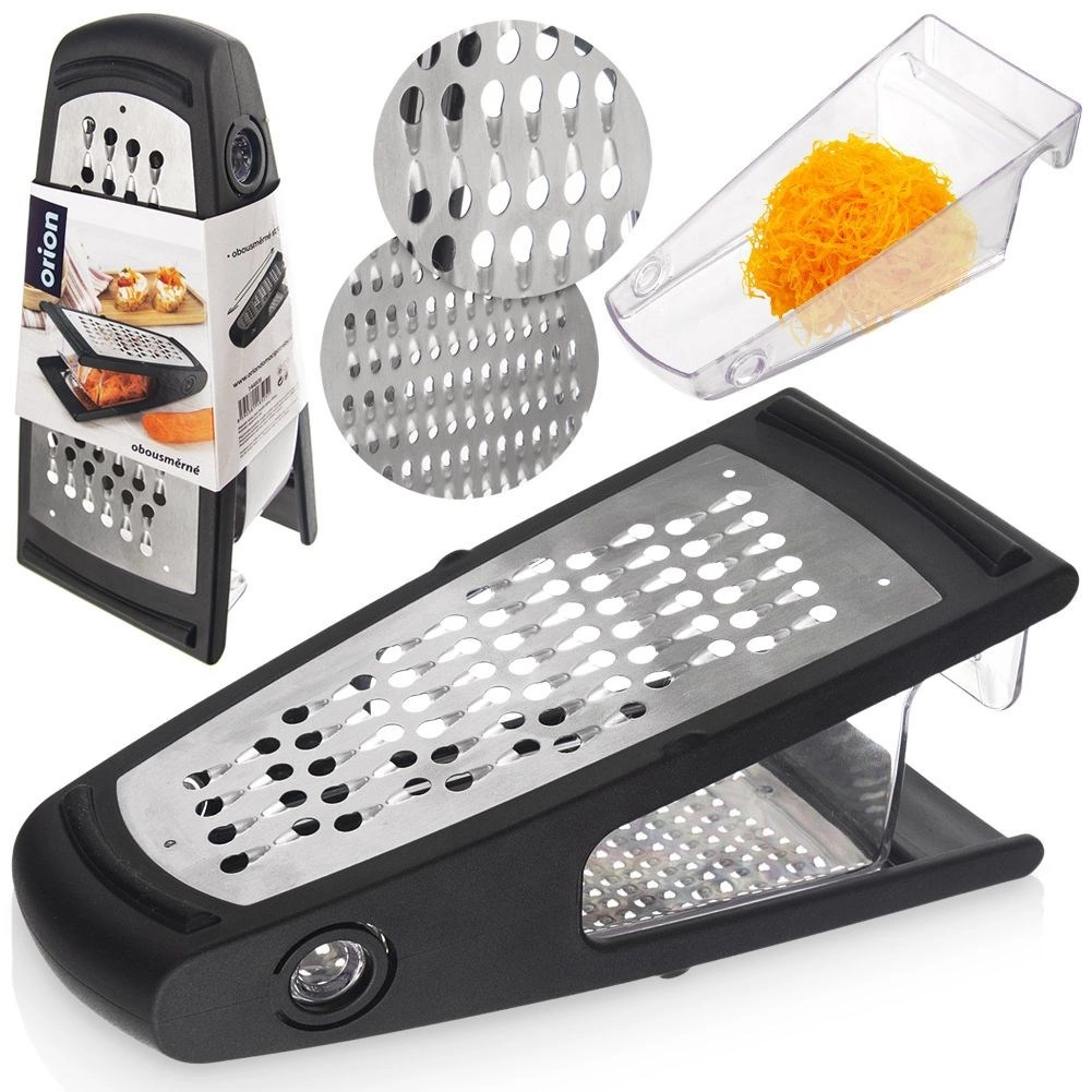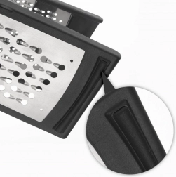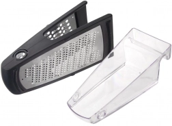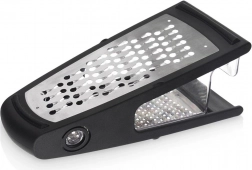 Universele keukenrasp met afneembare, transparante container die de voorbereiding vereenvoudigt en het werkblad schoon houdt. Twee verschillende raspvlakken zorgen voor perfecte resultaten bij het raspen van groenten, fruit, kazen, chocolade en specerijen. De stabiele antislipafwerking voorkomt verschuiven tijdens het werken.