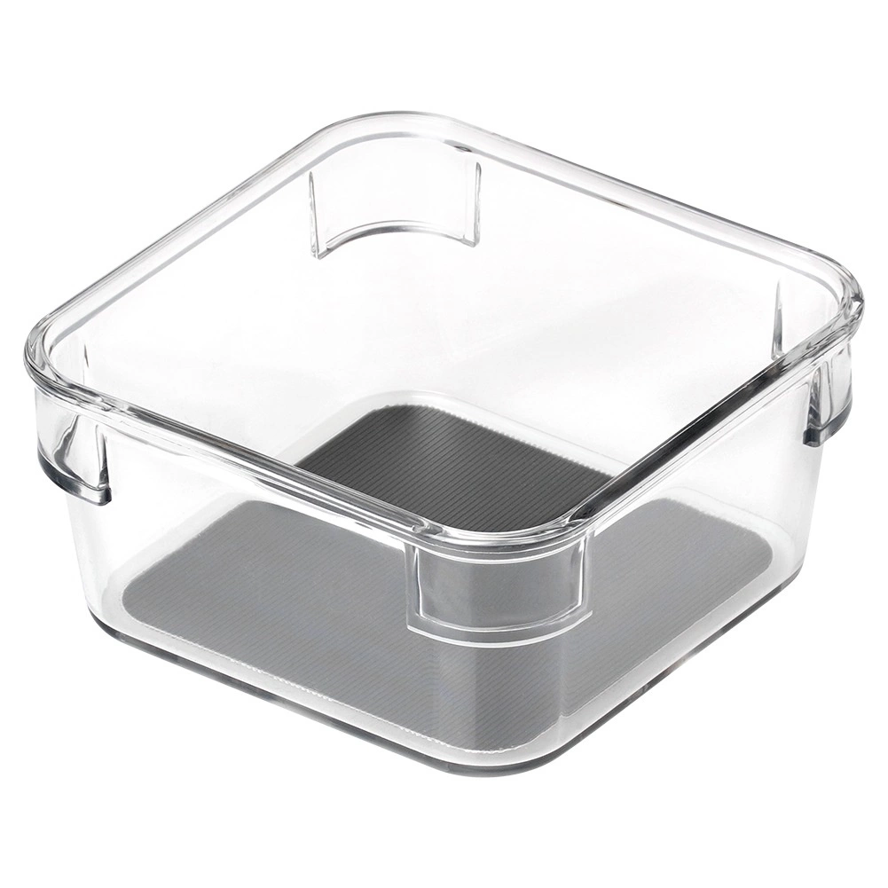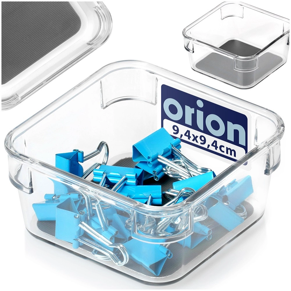 Praktische vierkante opbergorganizer met afmetingen 9 × 9 × 4,5 cm voor het overzichtelijk sorteren van spullen in lades, kastjes en op planken. Gemaakt van kwalitatief transparant plastic met een uitneembare grijze TPE-inleg. Dankzij antislipvoetjes en de inleg blijft alles netjes op zijn plaats. Universeel toepasbaar in de keuken, badkamer, kantoor en werkplaats, met de mogelijkheid tot stapelen bij aankoop van meerdere stuks.
