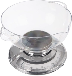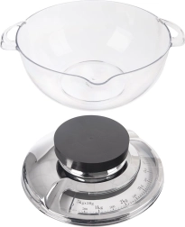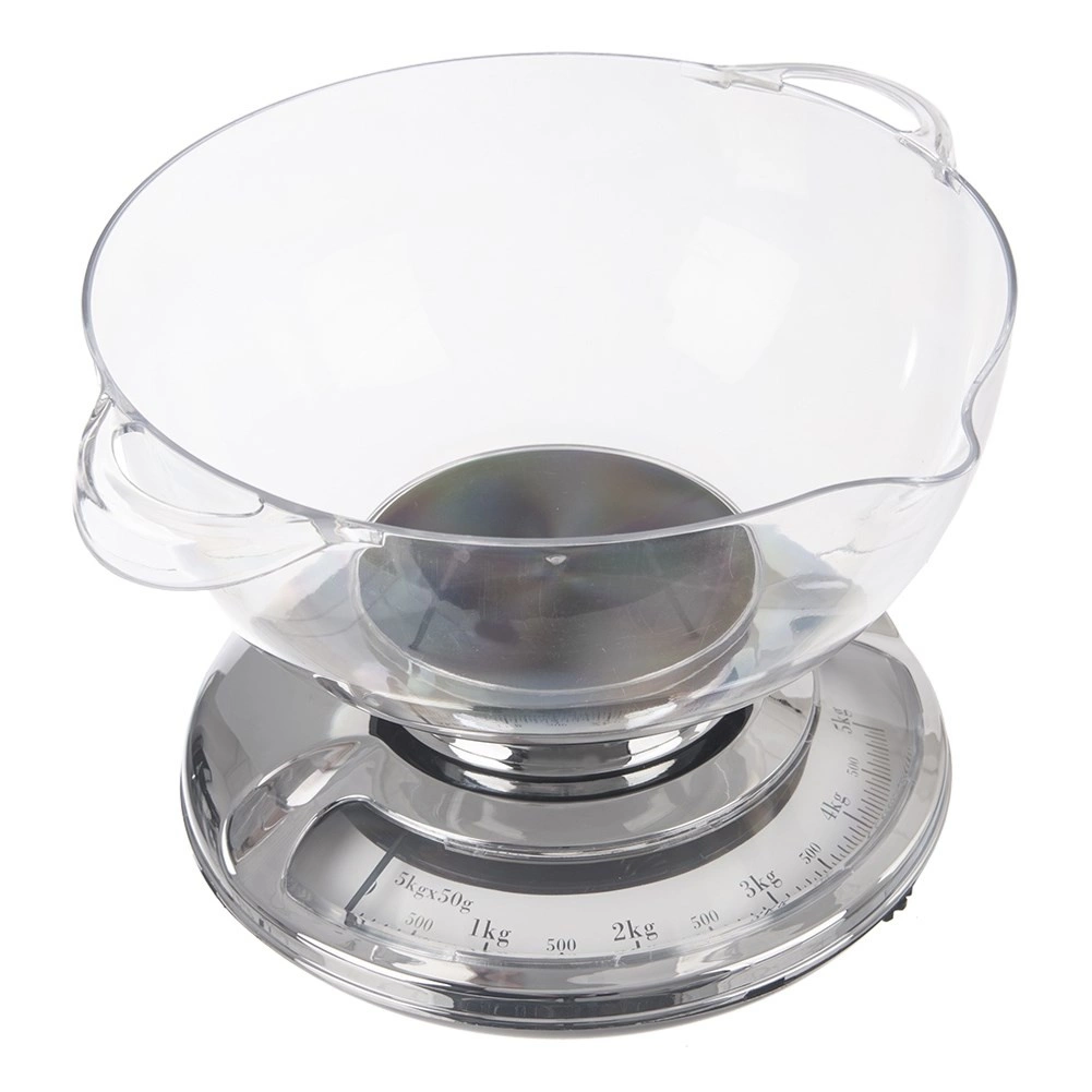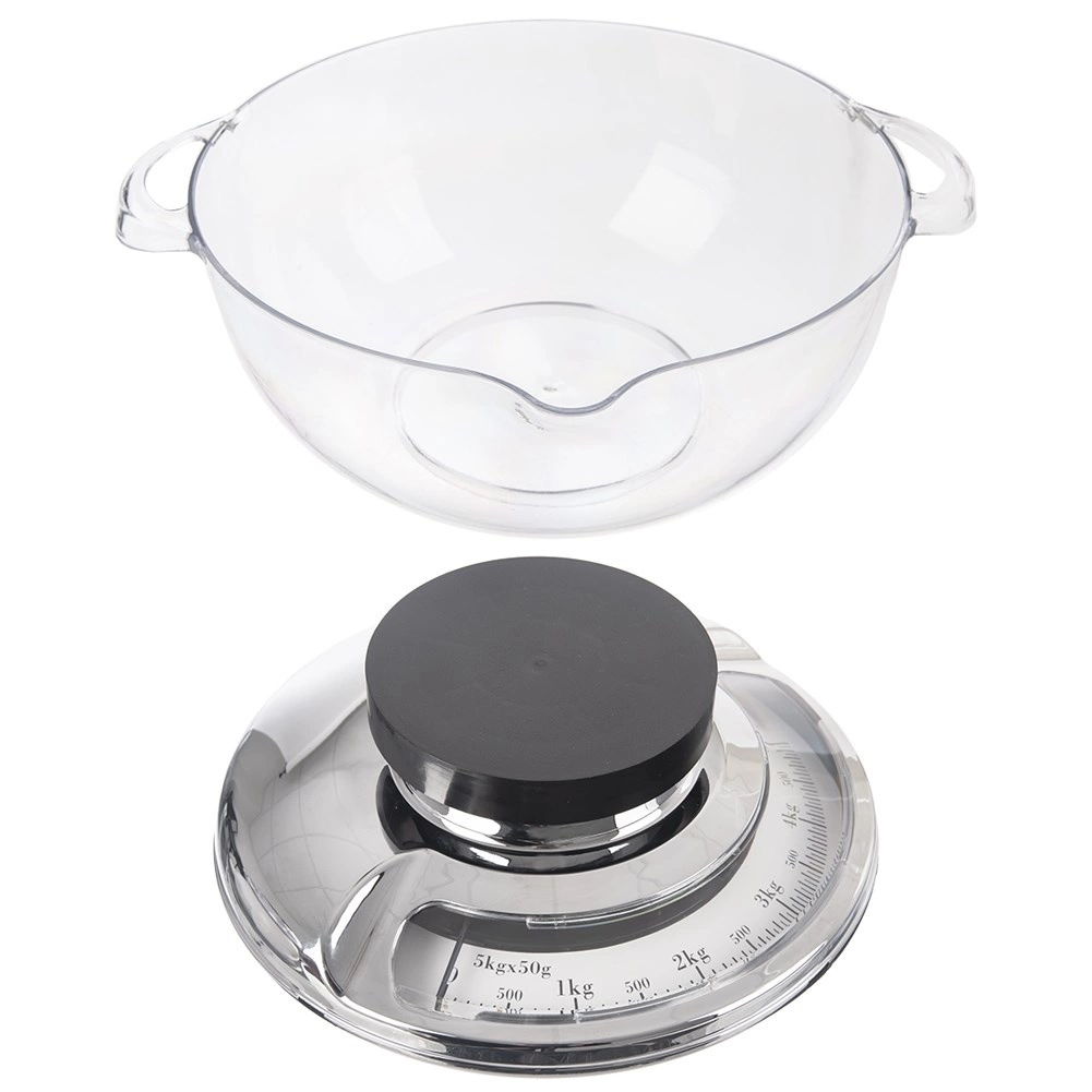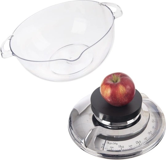 Praktische mechanische keukenweegschaal met afneembare kom en een maximaal draagvermogen van 5 kg, een betrouwbare hulp bij bakken en koken. Biedt duidelijke analoge meting in g en kg, nauwkeurige schaalverdeling en werking zonder batterijen. De ruime kom van 2,2 l met schenktuit en handgrepen vergemakkelijkt het werk, antislipvoetjes zorgen voor stabiliteit en bescherming van het werkblad.