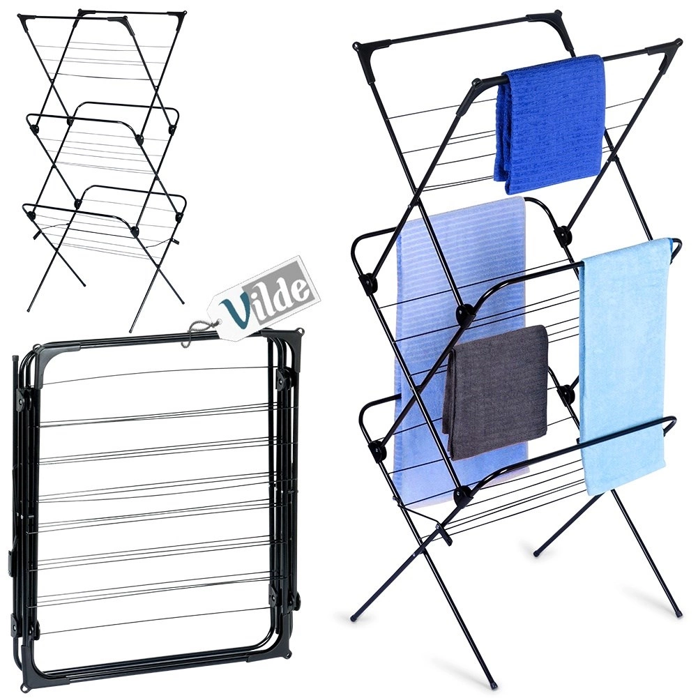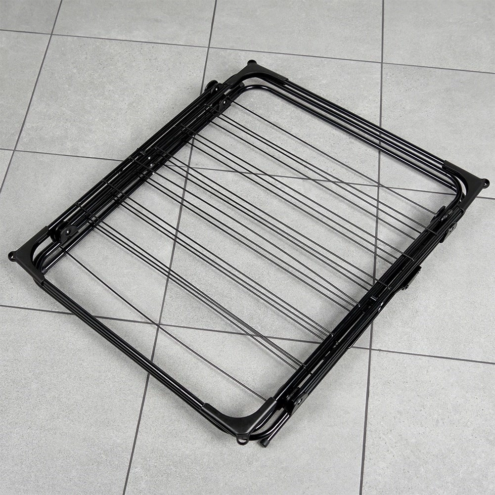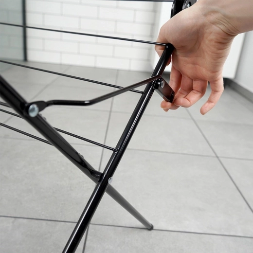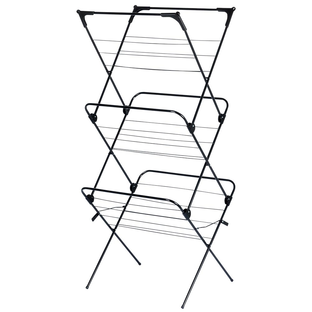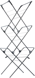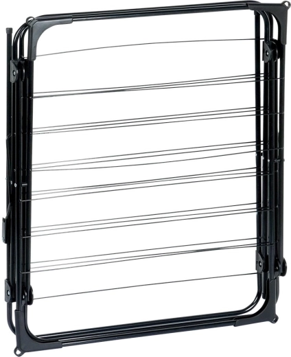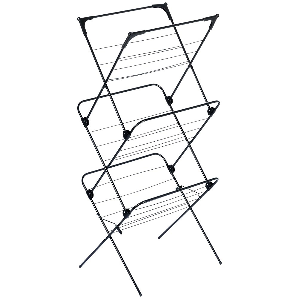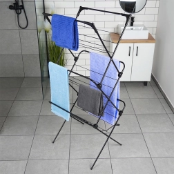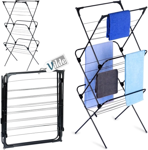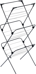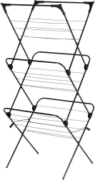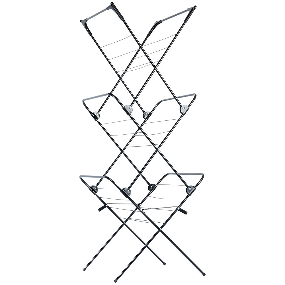 Dit verticale droogrek in elegante zwarte kleur is gemaakt van duurzaam, poedergecoat metaal. Drie niveaus bieden voldoende ruimte voor handdoeken, overhemden en fijne was, terwijl de stabiele X-constructie veilig gebruik binnen en buiten garandeert.