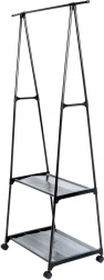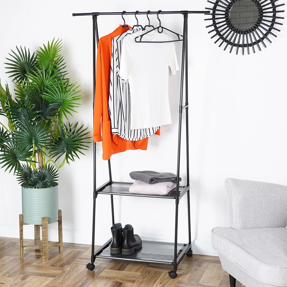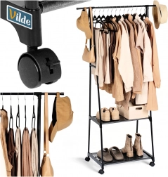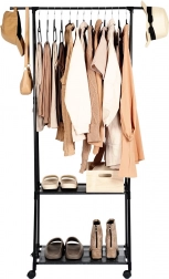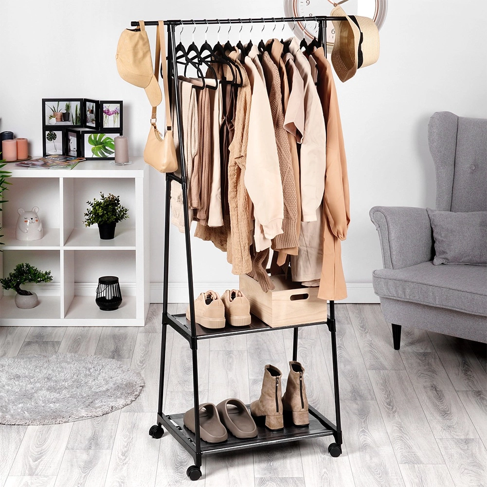 Elegant kledingrek in industriële loftstijl met een ruime boventrail voor het ophangen van kleding en twee onderplanken voor schoenen, tassen of opbergboxen. De volledig metalen uitvoering in het zwart is stevig, stabiel en onderhoudsvriendelijk, terwijl de polyester textielplanken licht en slijtvast zijn.
