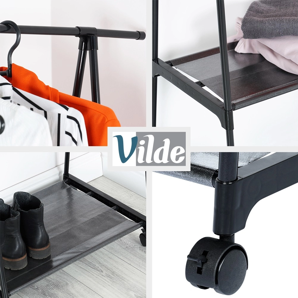 Dankzij vier wielen (twee met rem) verplaats je het rek moeiteloos naar waar je het nodig hebt – in de hal, slaapkamer, kleedruimte, het kantoor of de winkel. De smalle footprint bespaart ruimte en biedt toch verrassend veel capaciteit.