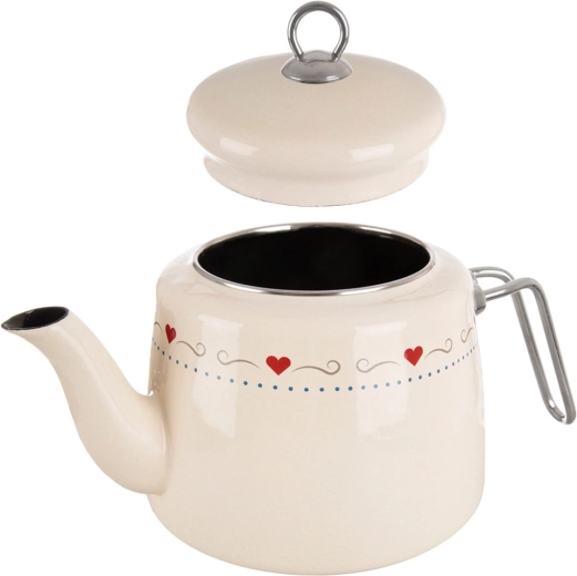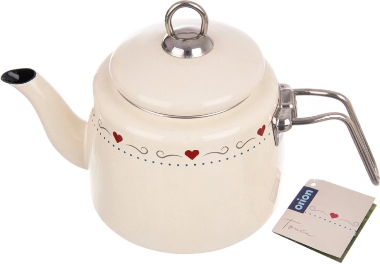 Elegante geëmailleerde waterketel met een inhoud van 1,6 l in crèmekleur met een subtiel hartjesmotief. Gemaakt van hoogwaardige geëmailleerde staal met een roestvrijstalen rand en handgreep. Geschikt voor alle type kookplaten, inclusief inductie, en voor de vaatwasser. De praktische deksel met greep maakt bijvullen gemakkelijk. ORION – origineel product dat voldoet aan Europese normen.
