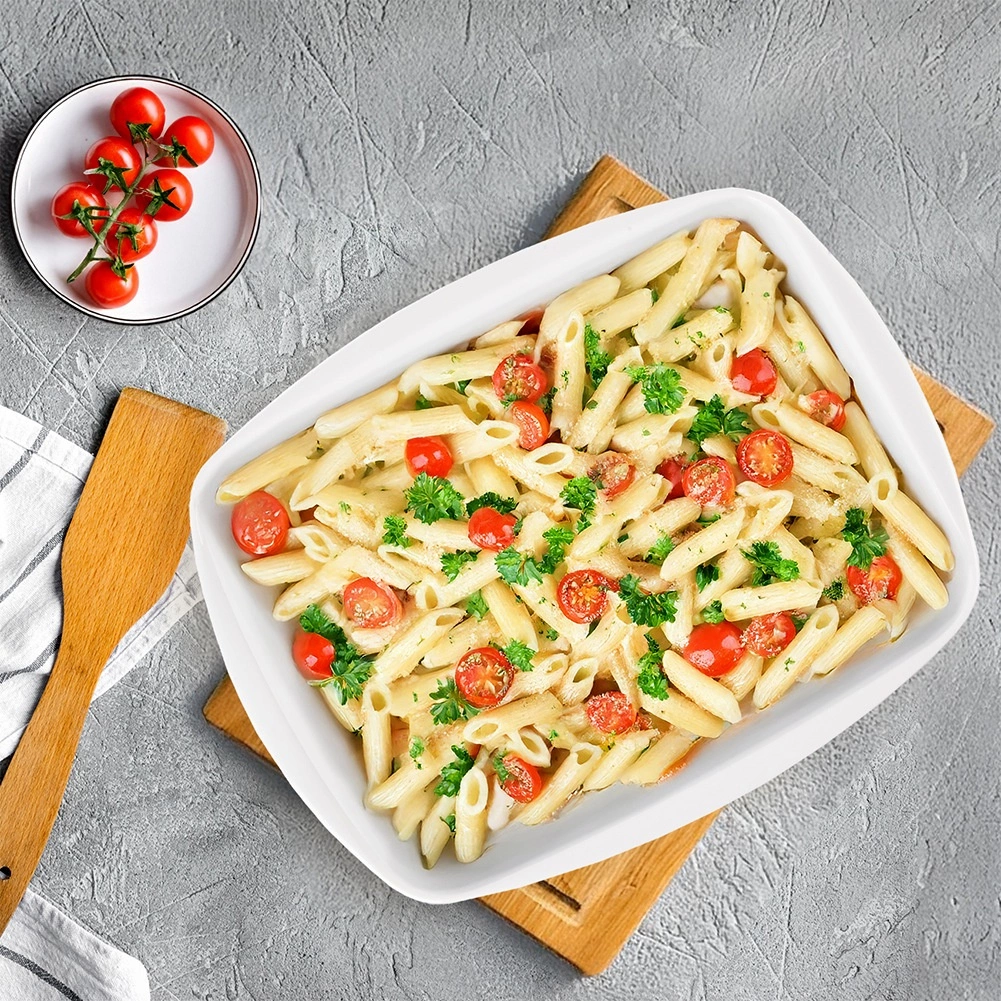 Deze ruime porseleinen schaal is een uitstekende keuze voor het bereiden van lasagne, gegratineerde aardappelen, groenten, vlees en zoete desserts. Het gladde binnenoppervlak zorgt voor eenvoudig lossen van gerechten en comfortabel reinigen. Dankzij het tijdloze witte design kun je gerechten direct stijlvol op tafel serveren.