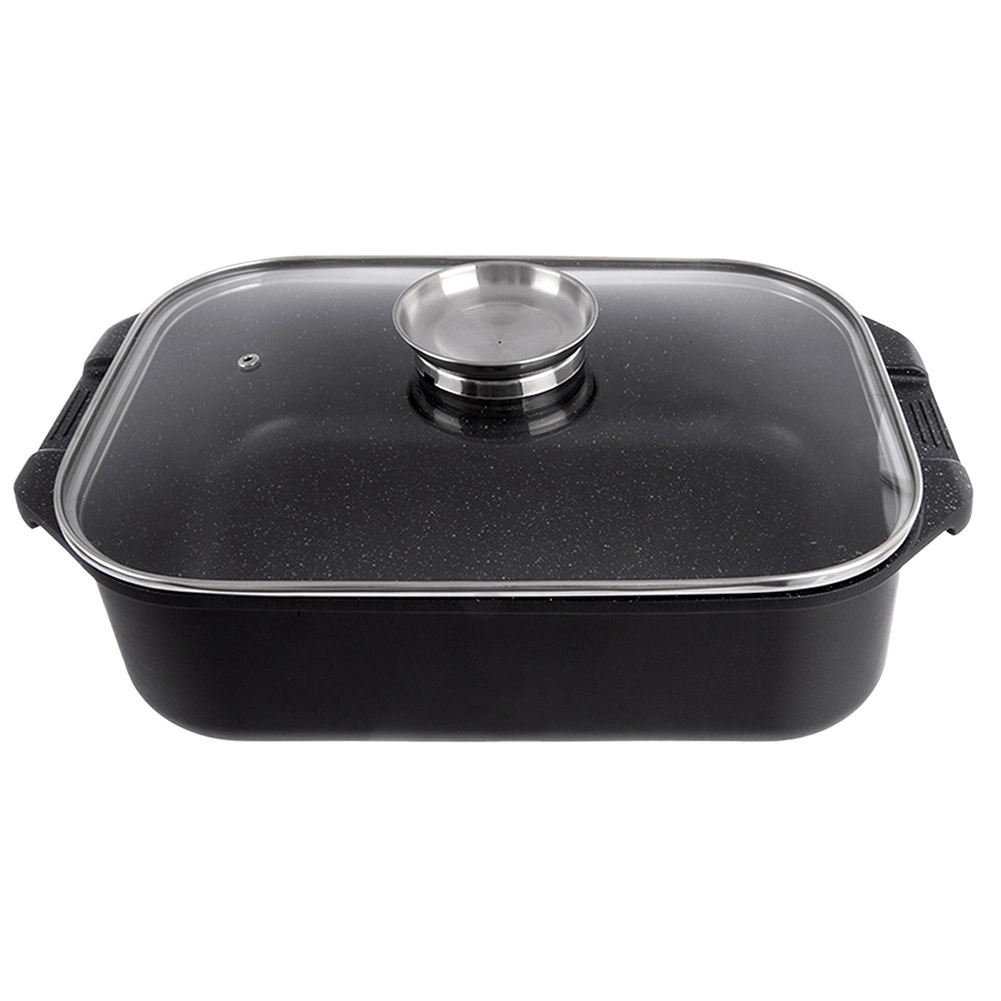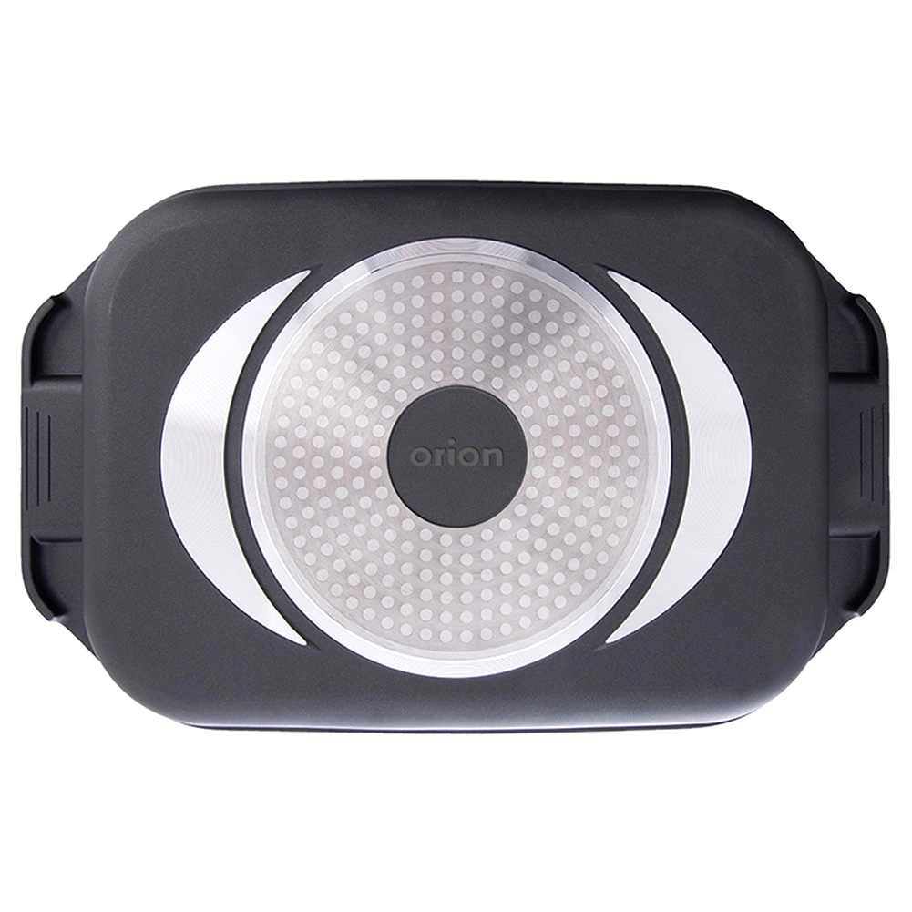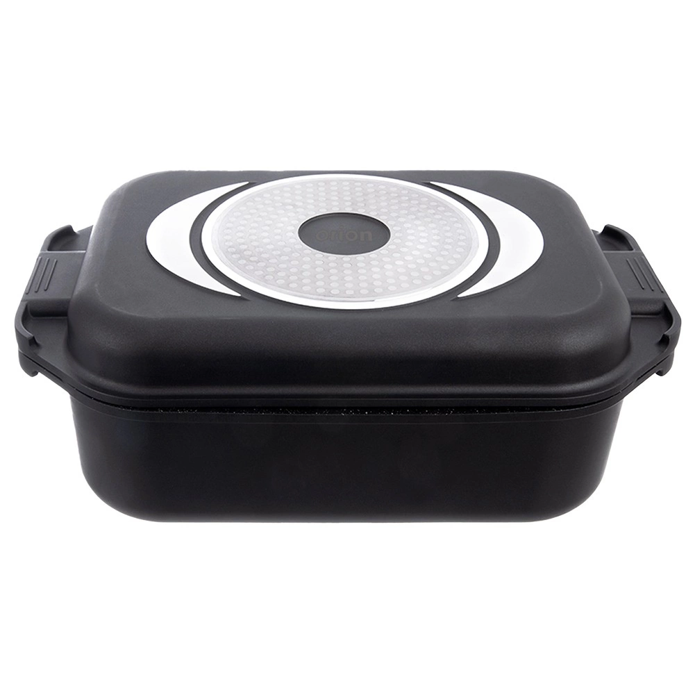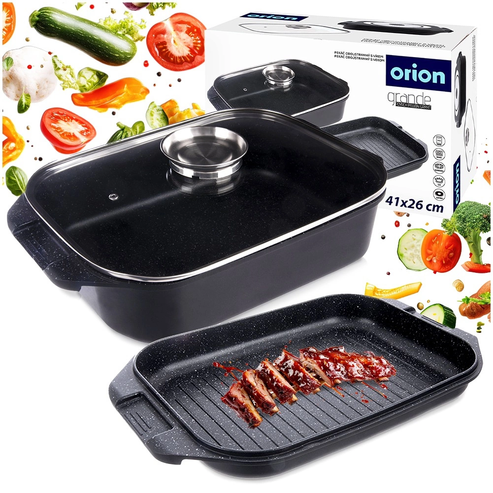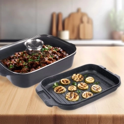De grillpan kunt u apart gebruiken of als deksel van de braadslede – ideaal voor bakken, braden en stoven. Het glazen deksel met praktische doseerder maakt het mogelijk water, wijn of vloeibare kruiden toe te voegen zonder het deksel op te tillen. De buitenzijde is voorzien van een PTFE-antiaanbaklaag voor eenvoudig onderhoud.