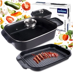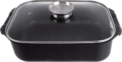 Universele set voor dagelijks koken: ruime braadslede van 7 l met een deksel in de vorm van een grillpan en een apart hittebestendig glazen deksel met doseerder voor vloeibare kruiden. Dubbele granieten laag PFLUON GRANIT op een aluminium gietwerk zorgt voor uitstekende antiaanbak-eigenschappen, gelijkmatige warmteverdeling en makkelijker reinigen.