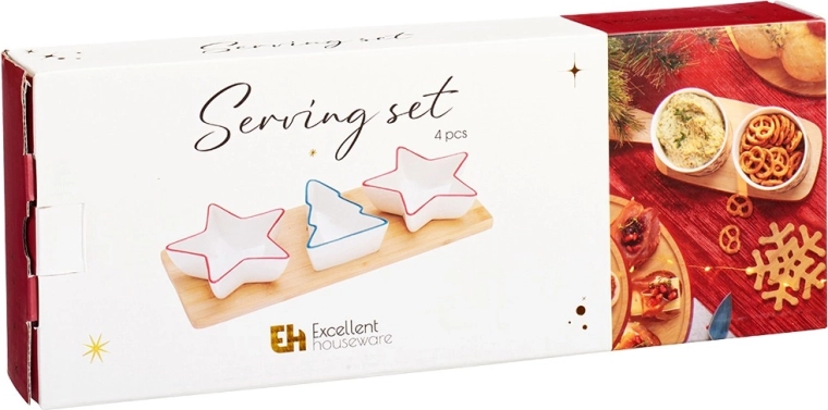 Elegante serveerset met dienblad, bestaande uit drie porseleinen schaaltjes – twee in de vorm van een ster en één in de vorm van een boompje – en een rechthoekig bamboe dienblad. Ideaal voor nootjes, olijven, dips en voorgerechten tijdens feestelijke bijeenkomsten. Hoogwaardig porselein in het wit en een stabiel bamboe dienblad met uitsparingen voor een betere fixatie van de schaaltjes. Schaaltjes vaatwasserbestendig (zonder dienblad).
