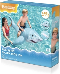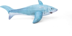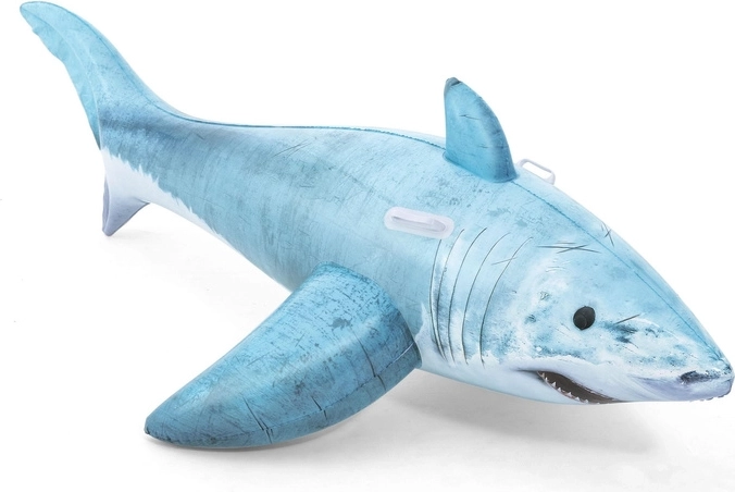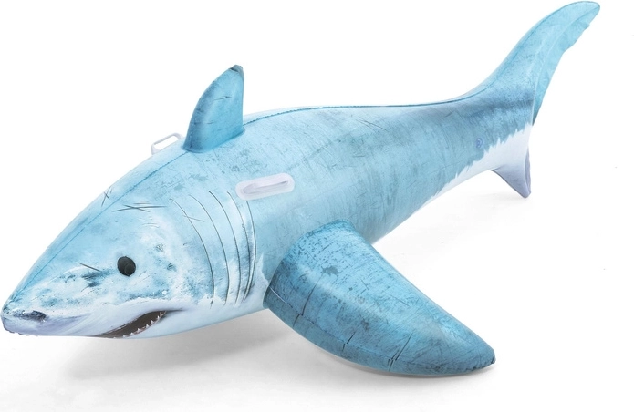 De haai met gedetailleerde print, vinnen en staart valt op in elk zwembad. Het formaat 183 × 102 cm biedt comfort en stabiliteit tijdens het rijden.