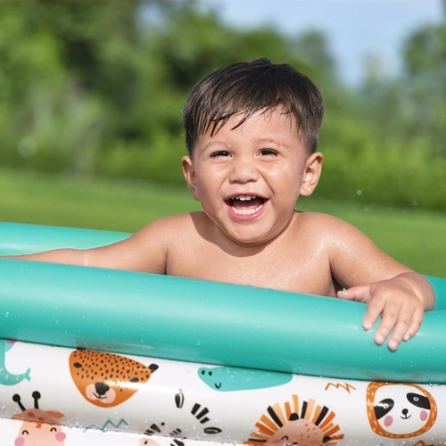 De lichte en veilige opblaasbare BESTWAY pool is ideaal om de allerkleinsten op hete dagen in de tuin of op vakantie af te koelen. Dankzij de driekamersconstructie, het slijtvaste PVC en terugslagventielen biedt hij stabiliteit, comfort en eenvoudig onderhoud. De vrolijke dierenprint maakt kinderen enthousiast en nodigt uit tot speels waterplezier.