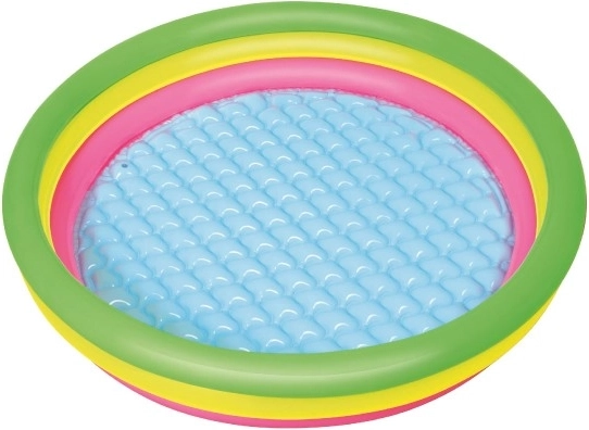 Het ronde zwembadje in regenboogkleuren van duurzaam vinyl biedt comfort en zekerheid bij de waterpret van kinderen. De zachte, opblaasbare en getextureerde bodem dempt stappen en isoleert tegen de kou van de grond, waardoor het ideaal is voor zowel het gazon als het terras. Drie afzonderlijk opblaasbare ringen behouden de vorm en verhogen de stabiliteit van de constructie.