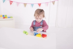 De stabiele houten basis en prettig grote stukjes zijn ideaal voor kleine handjes. Herhaald inleggen ondersteunt de fijne motoriek, geduld en logisch denken, en versterkt tegelijkertijd de eerste wiskundige vaardigheden en het ruimtelijk inzicht.