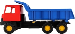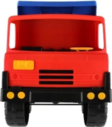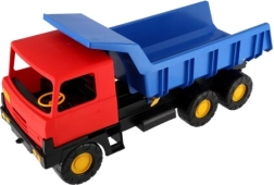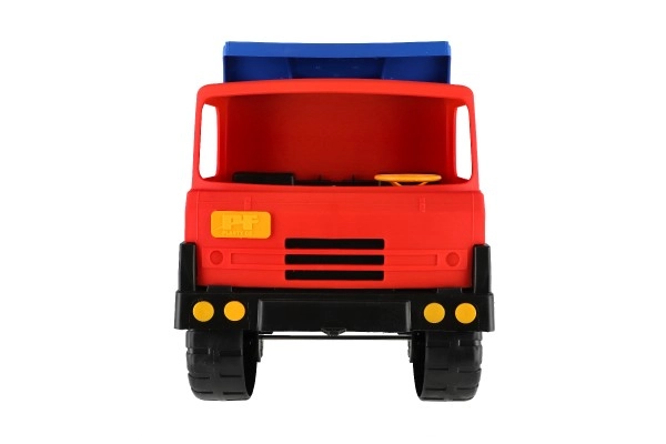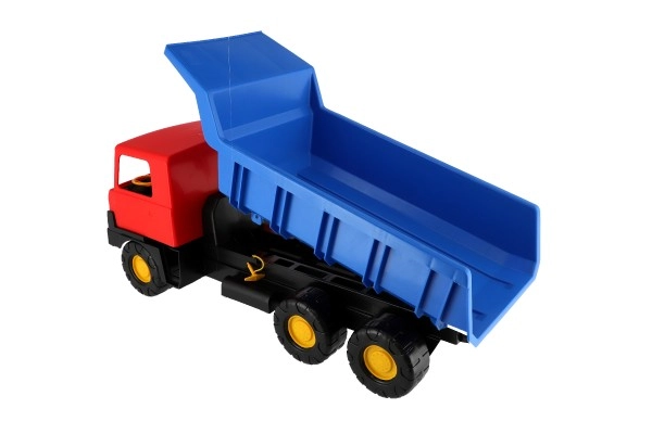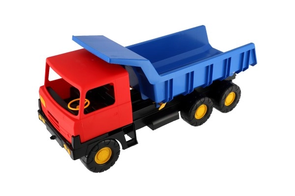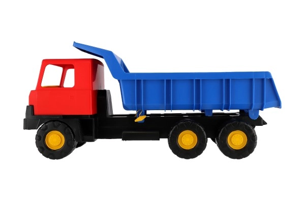 Robuuste kunststof vrachtwagen met een blauwe kiepbak en rode cabine van 75 cm lang, ideaal speelgoed voor zandbak en tuin. Biedt een functionele kiepbak voor realistisch spel en stimuleert creativiteit, motoriek en buitenspeelplezier.