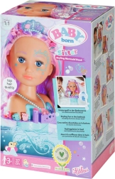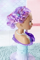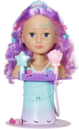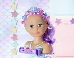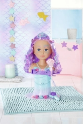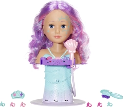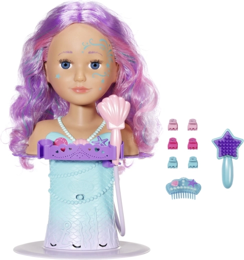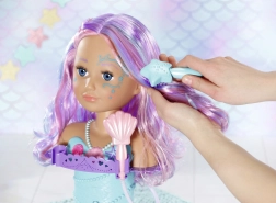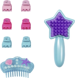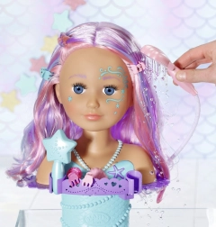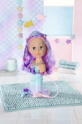 De BABY born Sister kopsalon Zeemeermin verandert elk bad in een onderwaterkapsalon. Ze hecht met stevige zuignappen aan het bad en zodra je de schelpvormige douchekop uitneemt, activeert zich de pomp – er stroomt echt water als de kop in het water staat. De gemakkelijk draaibare kop met geschilderde gelaatsdetails nodigt uit tot schminken en rollenspellen in de beautysalon.