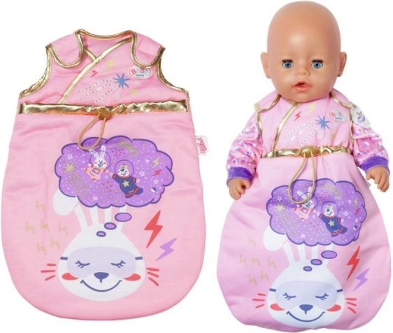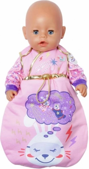 Gun je pop een ontspannen dutje in de zachte BABY BORN Happy Birthday-slaapzak. De stijlvolle galactische print met zon, maan, sterren en feestelijke motieven, aangevuld met gouden biezen, valt meteen op en past prachtig bij de verjaardagseditie.