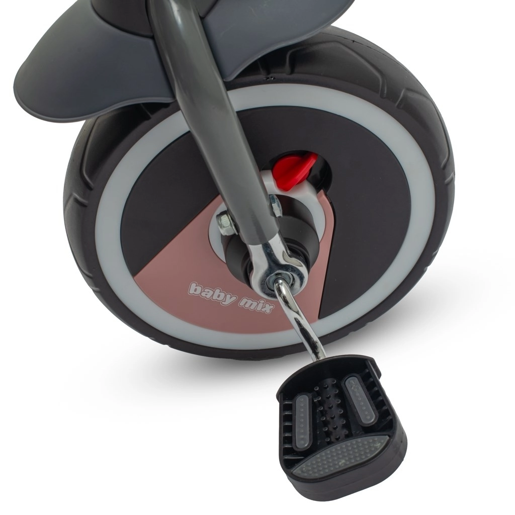 Het robuuste stalen frame en de wielen van gehard EVA-schuim zorgen voor stabiliteit, uitstekende grip en geen behoefte aan oppompen. Vrijloopfunctie, voetremmen op de achterwielen en een voorste spatbord verhogen comfort en controle. Dankzij de inklapbare constructie past de driewieler gemakkelijk in de kofferbak.