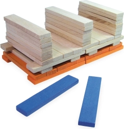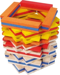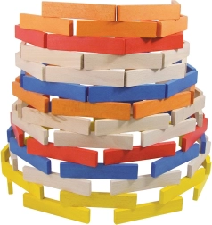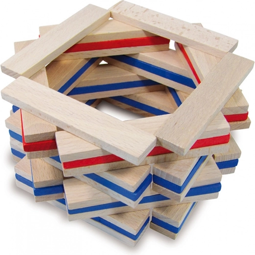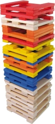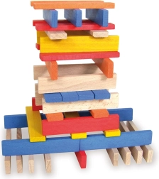 De set bevat 100 stevige, gladde plankjes in natuurlijke en opvallende kleuren – ideaal voor torens, huisjes en originele constructies.