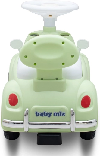 Stijlvolle kinderloopfiets BABY MIX Kiddo Cruiser in mint die kinderen veilig laat spelen, zowel binnen als buiten. Biedt comfortabele zit met rugleuning, een ergonomisch stuur voor gemakkelijk rijden, opbergruimte onder het zadel en stabiele vier wielen. Voor extra plezier zorgen voorste LED-lampen en ingebouwde melodieën, die bewegen leuk maken en de motoriek stimuleren.