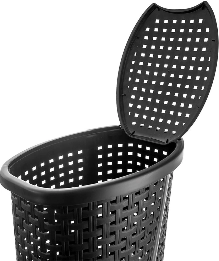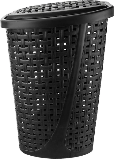 Praktische wasmand van 45 l met afsluitbaar deksel in een elegante zwarte kleur. Dankzij de slanke vorm, de geventileerde rattan-look en het lichte maar stevige kunststof past hij perfect naast de wasmachine en in kleinere badkamers. Geïntegreerde handgrepen, ademende perforaties om geurtjes te beperken en eenvoudig openen van het deksel zorgen voor comfortabel dagelijks gebruik.